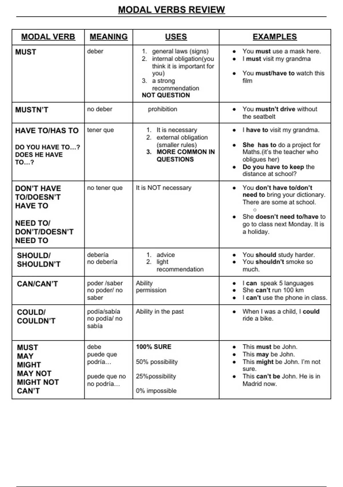 Pequeño resumen esquema de repaso de todos los verbos modales, especialmente útil para la asignatura de primera lengua extranjera.