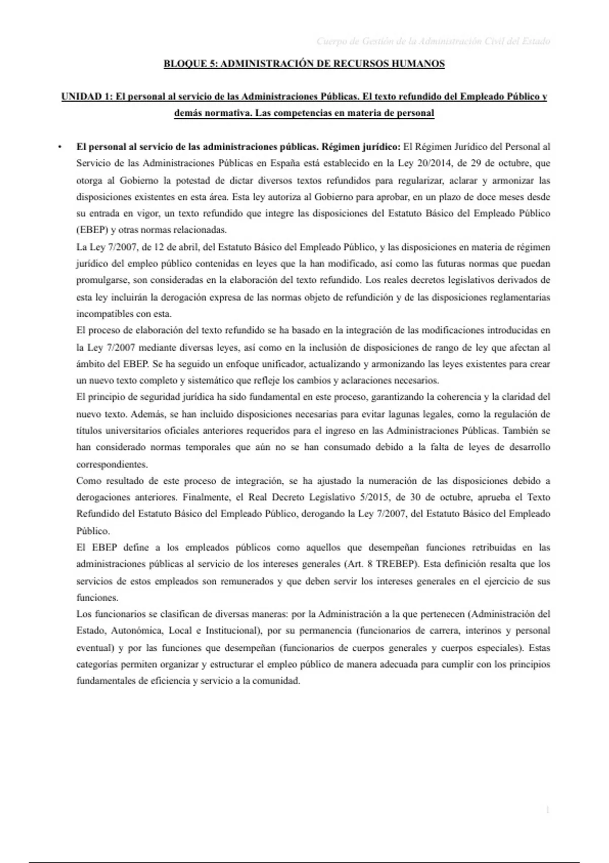 UNIDAD 1: El personal al servicio de las Administraciones Públicas. El texto refundido del Empleado Público y