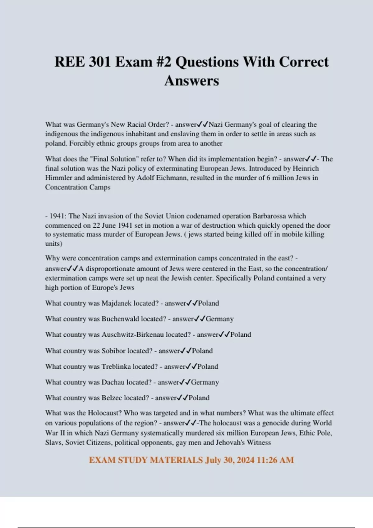 REE 301 Exam #2 Questions With Correct Answers What was Germany's New Racial Order? - answerNazi Germany's goal of clearing the indigenous the indigenous inhabitant and enslaving them in order to settle in areas such as poland. Forcibly ethnic groups groups from area to another What does the "Final Solution" refer to? When did its implementation begin? - answer- The final solution was the Nazi policy of exterminating European Jews. Introduced by Heinrich Himmler and administered by Adolf Eichmann, resulted in the murder of 6 million Jews in Concentration Camps - 1941: The Nazi invasion of the Soviet Union codenamed operation Barbarossa which commenced on 22 June 1941 set in motion a war of destruction which quickly opened the door to systematic mass murder of European Jews. ( jews started being killed off in mobile killing units) Why were concentration camps and extermination camps concentrated in the east? - answerA disproportionate amount of Jews were centered in the East, so the concentration/ extermination camps were set up neat the Jewish center. Specifically Poland contained a very high portion of Europe's Jews What country was Majdanek located? - answerPoland What country was Buchenwald located? - answerGermany What country was Auschwitz-Birkenau located? - answerPoland What country was Sobibor located? - answerPoland What country was Treblinka located? - answerPoland What country was Dachau located? - answerGermany What country was Belzec located? - answerPoland What was the Holocaust? Who was targeted and in what numbers? What was the ultimate effect on various populations of the region? - answer-The holocaust was a genocide during World War II in which Nazi Germany systematically murdered six million European Jews, Ethic Pole, Slavs, Soviet Citizens, political opponents, gay men and Jehovah's Witness EXAM STUDY MATERIALS July 30, 2024 11:26 AM -Jews (6 Million deaths) Soviets Civilians (7 million deaths), Soviet Prisoners of War( 3 million deaths), Non-Jewish Polish civilians (1.8 million deaths) Serb Civilians (312,000) People with Disabilities (250,000), Roma (200,000), Jehovah's Witnesses (1900), ascials ( repeat criminal offenders) (70,000), Homosexuals (100's- 1,000's) Explain the "they did it, not us" narrative that developed in Eastern Europe. - answerMany within Eastern Europe cooperated with the Nazis and were directly and indirectly responsible for atrocities, yet after the war blamed the Germans completely, trying to paint themselves as helpless victims of the Nazis What impact did WWII have on Soviet Union, its army, and its population? - answer70% of industrial outpost was spent on the military during WWII leading to homelessness and starvation. In total, an estimate 7 million soviets died because of WWII Who was Heda Kovály? Provide 3 significant facts from her biography. - answer- Married rudolf Margolius in 1939 - 1941: Deported to Lodz Ghetto in Poland along with 5,000 Prague Jews - Husband was made deputy minister in Czechoslovakia by the soviets was later hanged. How were Heda Kovály's experiences during WWII representative of the broader Jewish experience during WWII? - answerHeda Kovaly and Jews in general found that the local population under Nazi control aligned themselves with the Nazi goals because it benefited from the Jewish suffering. Even if they didn't help the Nazis, harboring jews was too dangerous How did the experiences of those who lived through WWII impact their attitudes towards Communism? - answerMany who had lived through WWII viewed communism as an acceptable state of being because they had known authoritarianism for so long that the Soviets seemed to simple be better than the alternative, not recognizing that functional democracy as a viable alternative (also seen as saviors from the nazis) "The Soviets came in and forced communism on the countries of Eastern Europe." How would you respond to such a claim? - answerThe soviets did not force communism on the countries of Eastern Europe but where instead seen as liberators from the Nazi oppression. The Book" under a cruel star" describes the occupants of Soviets controlled Czechoslovakia as willingly adopting the socialist movement and actively participating in its construction without much if any resistance. Who was Rudolf Slánský? - answer- General secretary of the Czechoslovak Communist party - Slansky was one of 14 leaders arrested in 1951