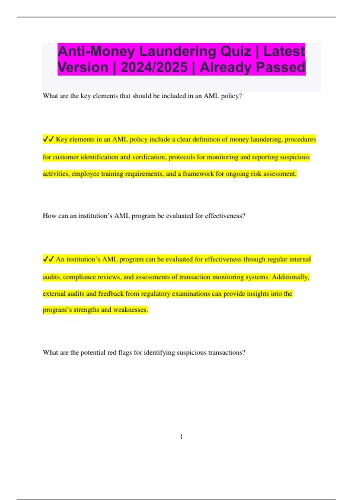 Anti-Money Laundering Quiz | Latest Version | 2024/2025 | Already Passed What are the key elements that should be included in an AML policy? Key elements in an AML policy include a clear definition of money laundering, procedures for customer identification and verification, protocols for monitoring and reporting suspicious activities, employee training requirements, and a framework for ongoing risk assessment. How can an institution’s AML program be evaluated for effectiveness? An institution’s AML program can be evaluated for effectiveness through regular internal audits, compliance reviews, and assessments of transaction monitoring systems. Additionally, external audits and feedback from regulatory examinations can provide insights into the program’s strengths and weaknesses. What are the potential red flags for identifying suspicious transactions? 2 Potential red flags for identifying suspicious transactions include large cash deposits or withdrawals, frequent and unexplained transfers between accounts, transactions inconsistent with a customer’s known business activities, and patterns that suggest structuring or layering. How can financial institutions manage AML risks associated with digital currencies? Financial institutions manage AML risks associated with digital currencies by implementing robust transaction monitoring systems, conducting thorough customer due diligence, and adhering to regulations specific to digital assets, such as anti-money laundering and counter- terrorism financing laws. What role do compliance officers play in developing and implementing AML training programs? Compliance officers play a crucial role in developing and implementing AML training programs by creating curriculum that addresses current regulations, ensuring training is relevant to all employees, and evaluating the effectiveness of the training through assessments and feedback. How should institutions handle cross-border transactions to ensure AML compliance?