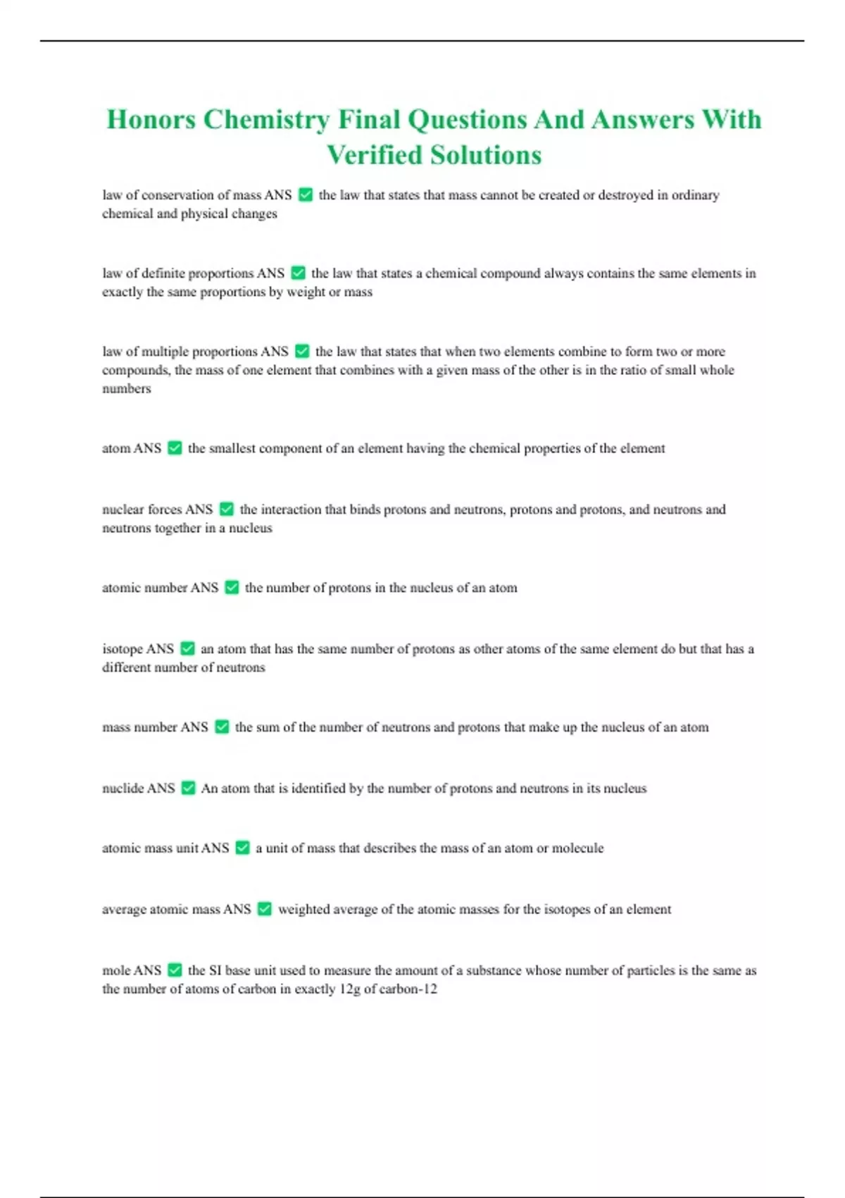 Honors Chemistry Final Questions And Answers With Verified Solutions law of conservation of mass ANS the law that states that mass cannot be created or destroyed in ordinary chemical and physical changes law of definite proportions ANS the law that states a chemical compound always contains the same elements in exactly the same proportions by weight or mass law of multiple proportions ANS the law that states that when two elements combine to form two or more compounds, the mass of one element that combines with a given mass of the other is in the ratio of small whole numbers atom ANS the smallest component of an element having the chemical properties of the element