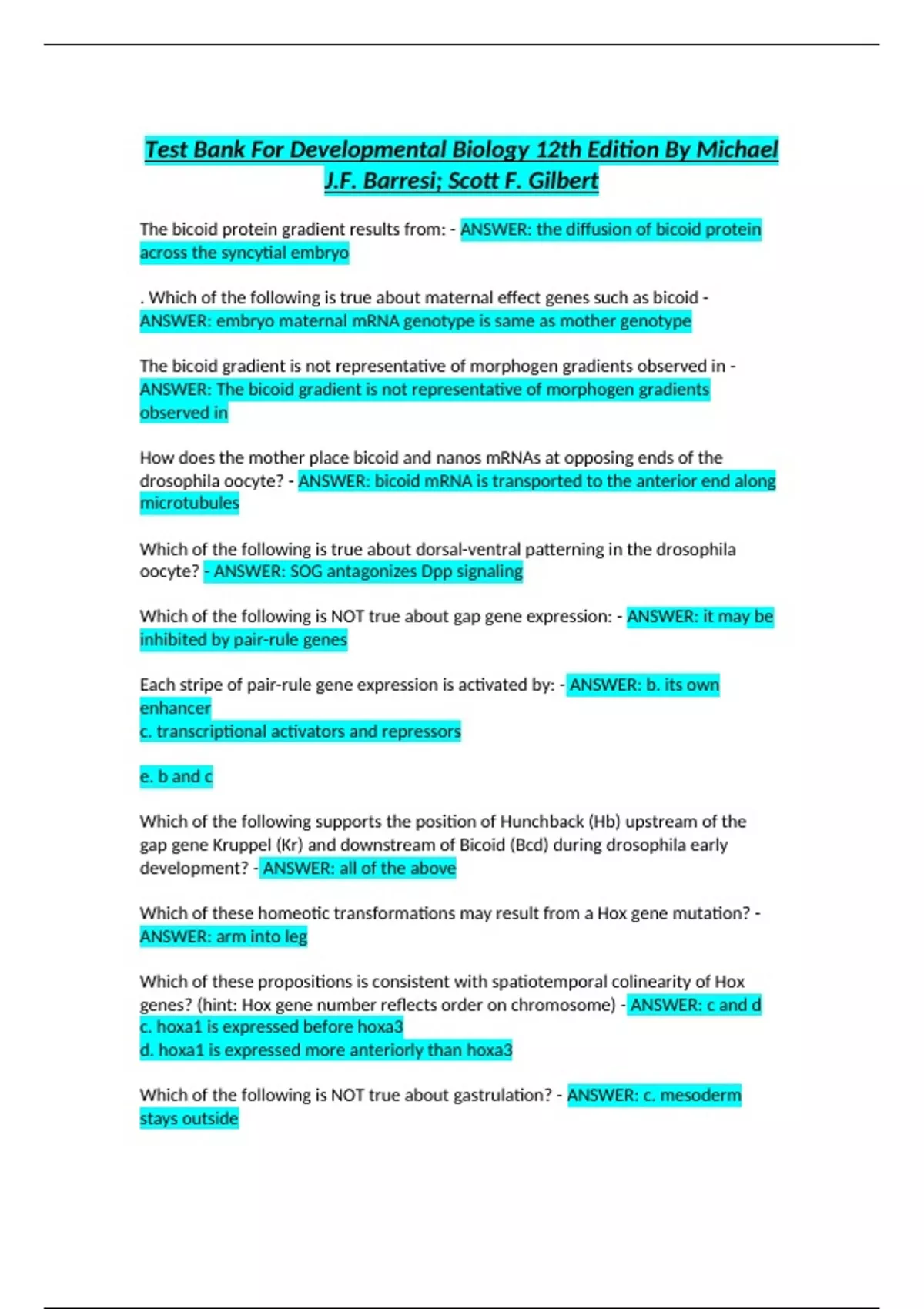 Test Bank For Developmental Biology 12th Edition By Michael