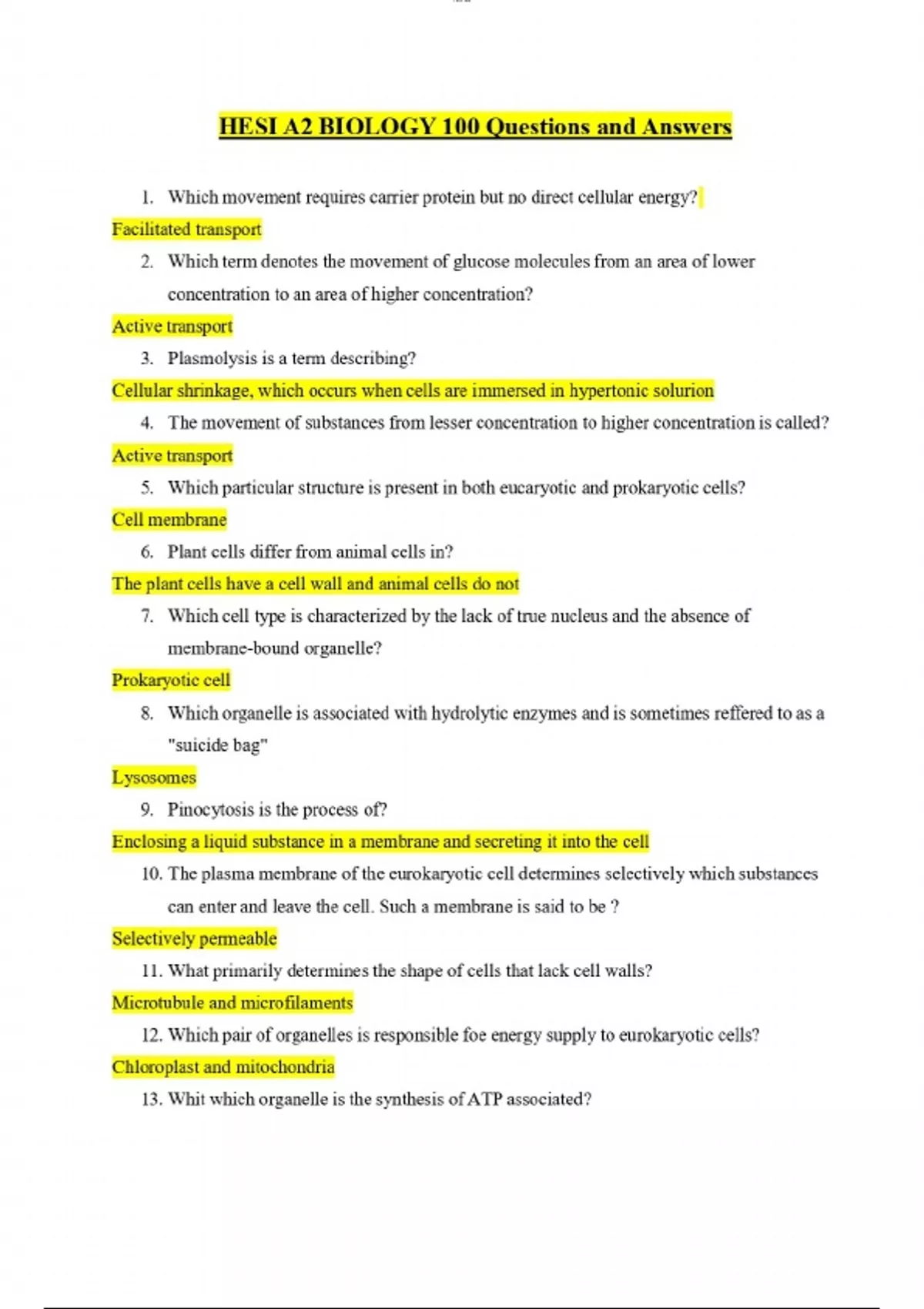 HESI A2 BIOLOGY Exam Questions and Answers
