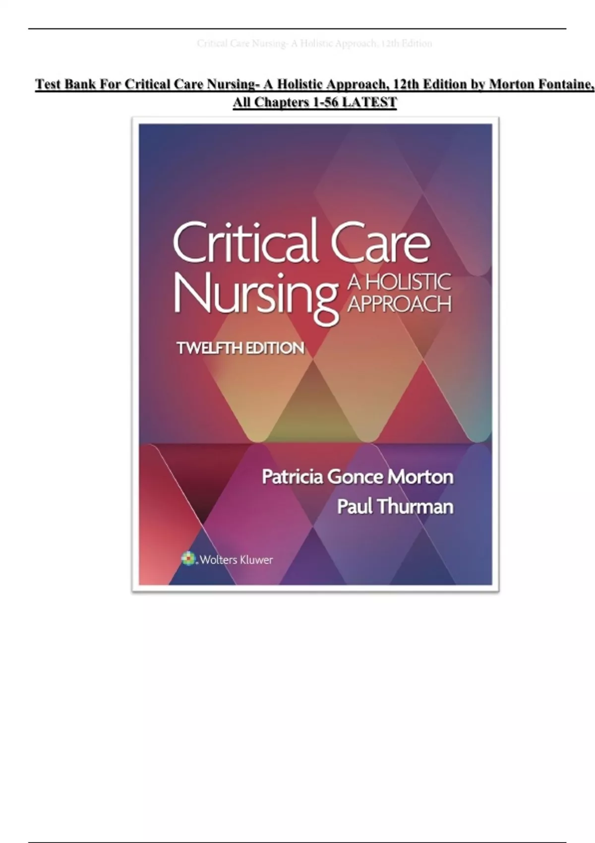 Test Bank For Critical Care Nursing- A Holistic Approach, 12th Edition by Morton Fontaine, All Chapters 1-56 LATEST 2024|2025