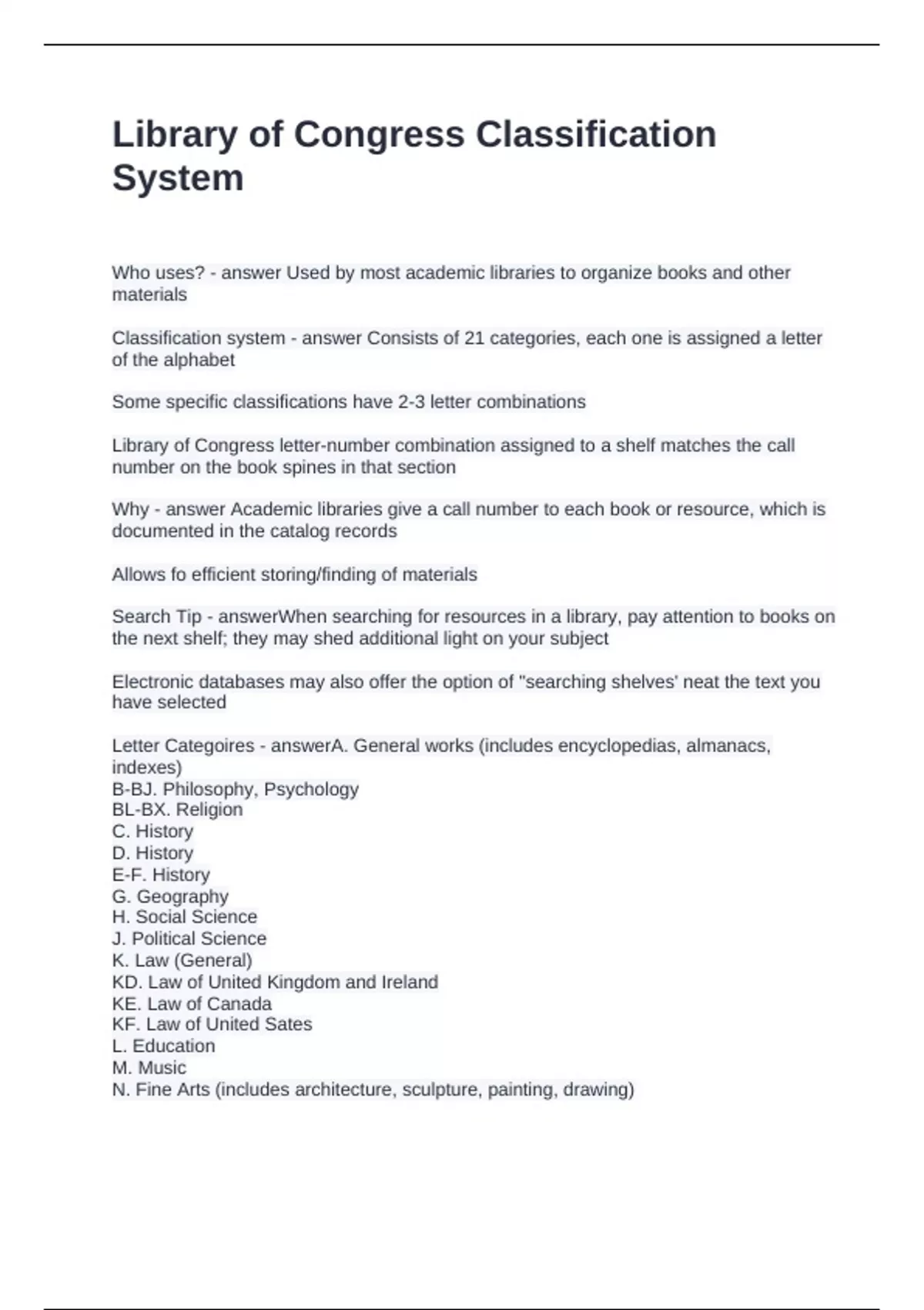 Library of Congress Classification System Questions and Answers 100% Accurate