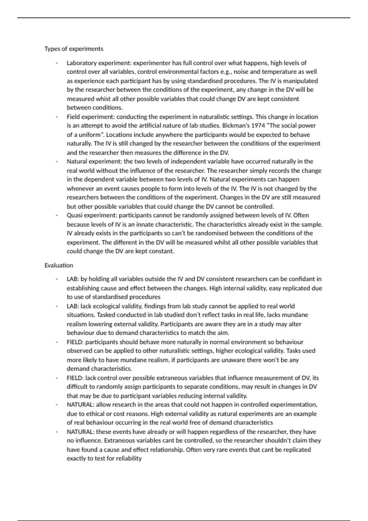 - Laboratory experiment: experimenter has full control over what happens, high levels of