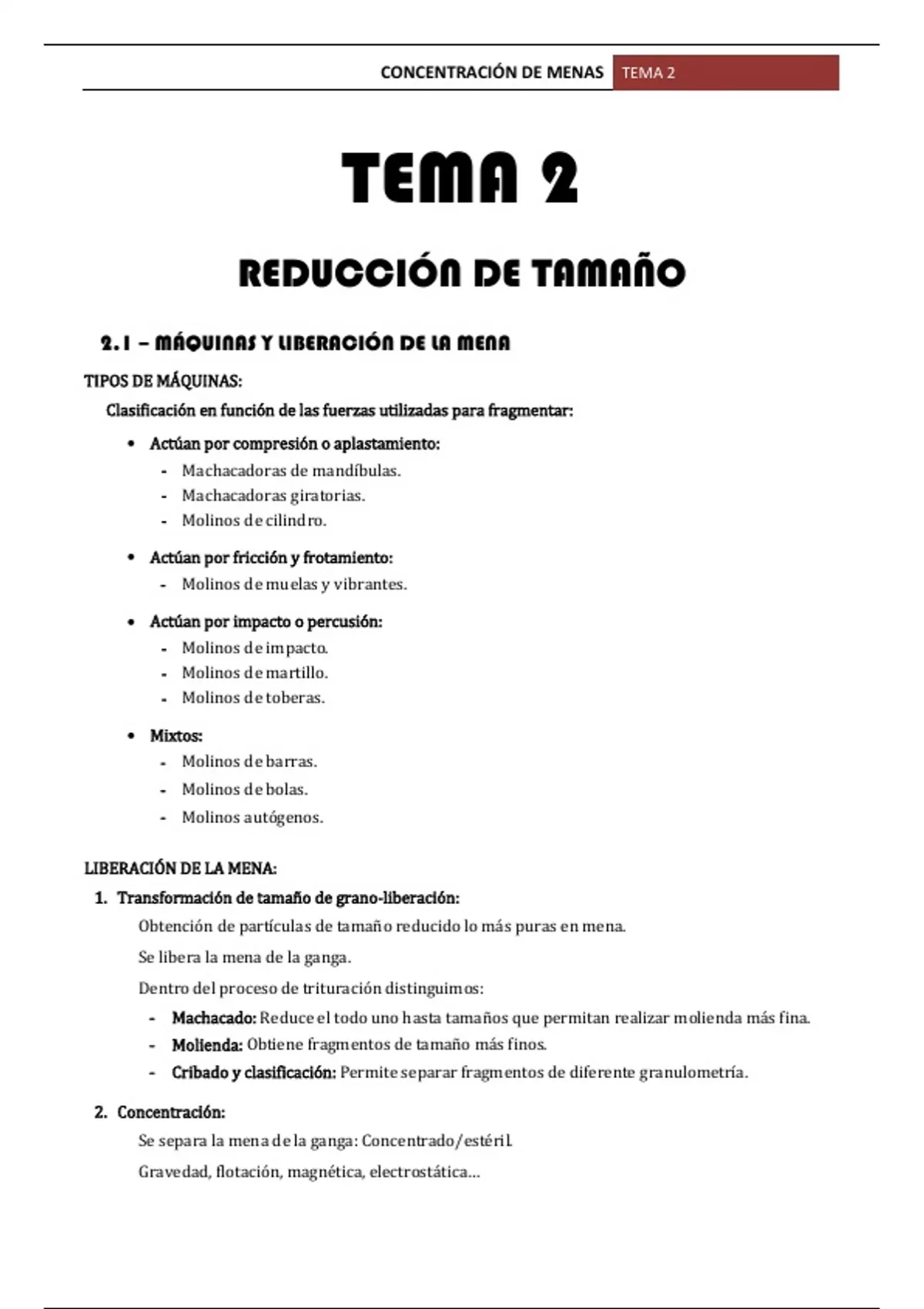 1. Máquinas y liberación de la mena 2. Teoría de la fragmentación 3. Actúan por compresión o aplastamiento 4. Molinos de impacto o percusión 5. Molinos mixtos 6. Revestimientos