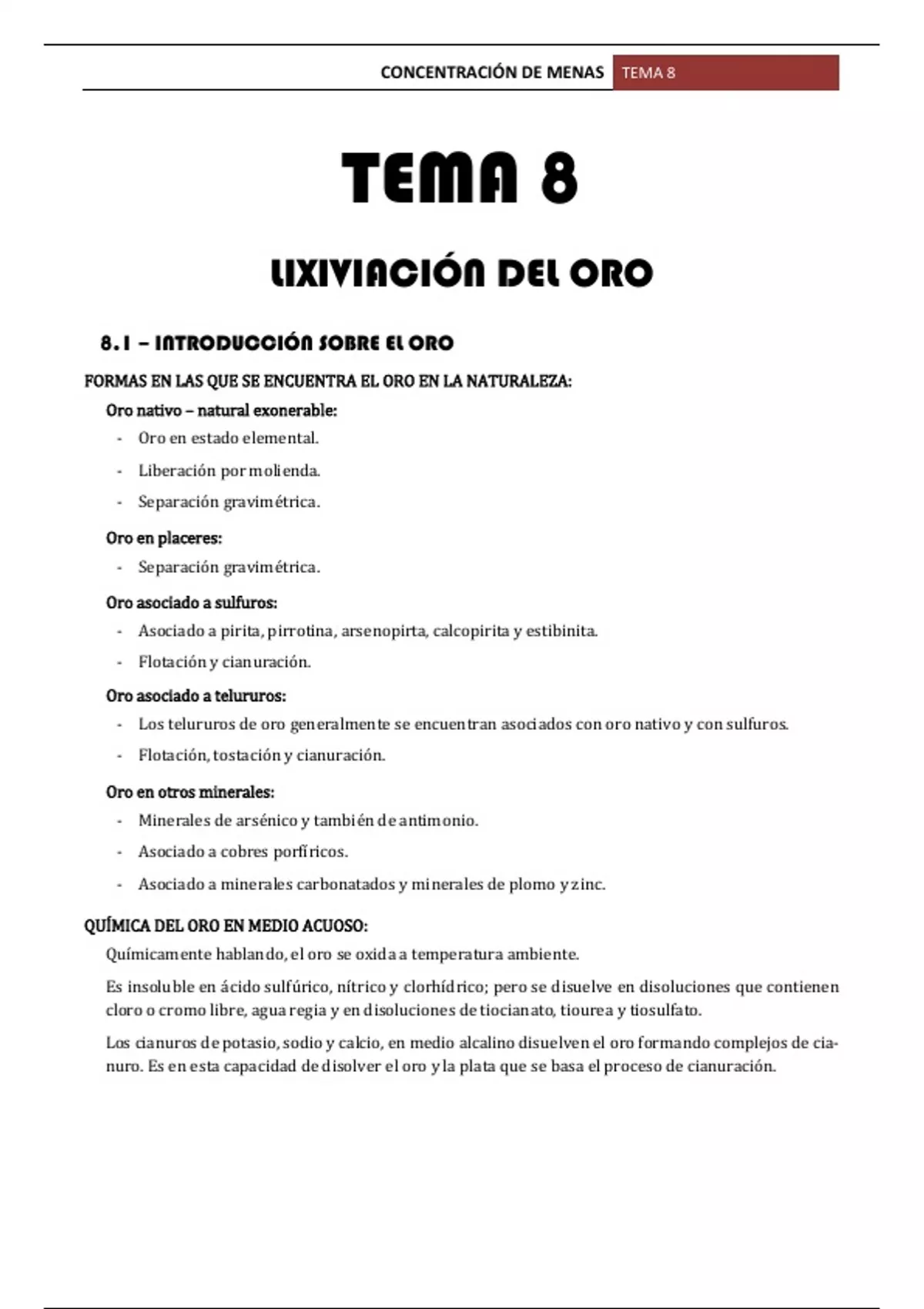 Sumario Tema 8 - Lixiviación del oro