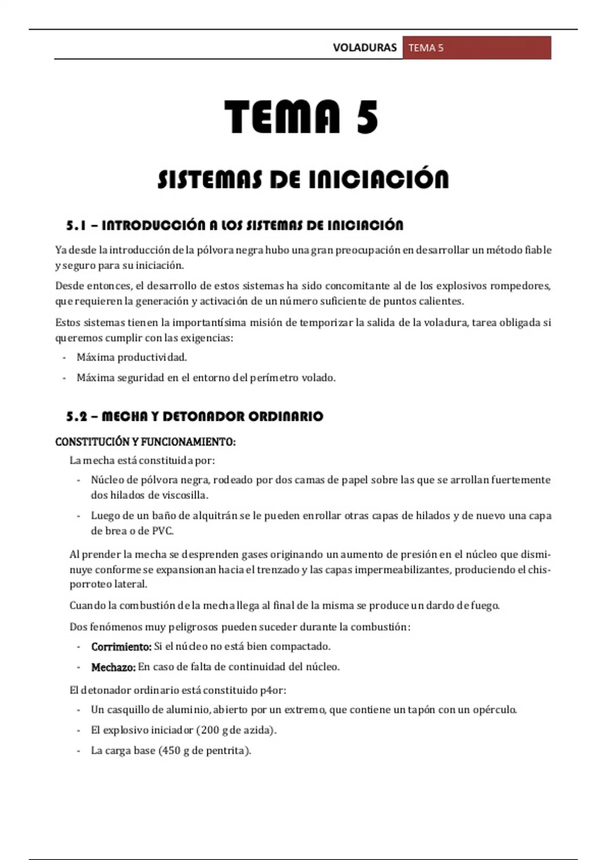 1. Introducción a los sistemas de iniciación 2. Mecha y detonador ordinario 3. Cordón detonante y relé de retardo 4. Multiplicadores 5. Sistema eléctrico 6. Sistema no eléctrico (NONEL) 7. Sistema electrónico