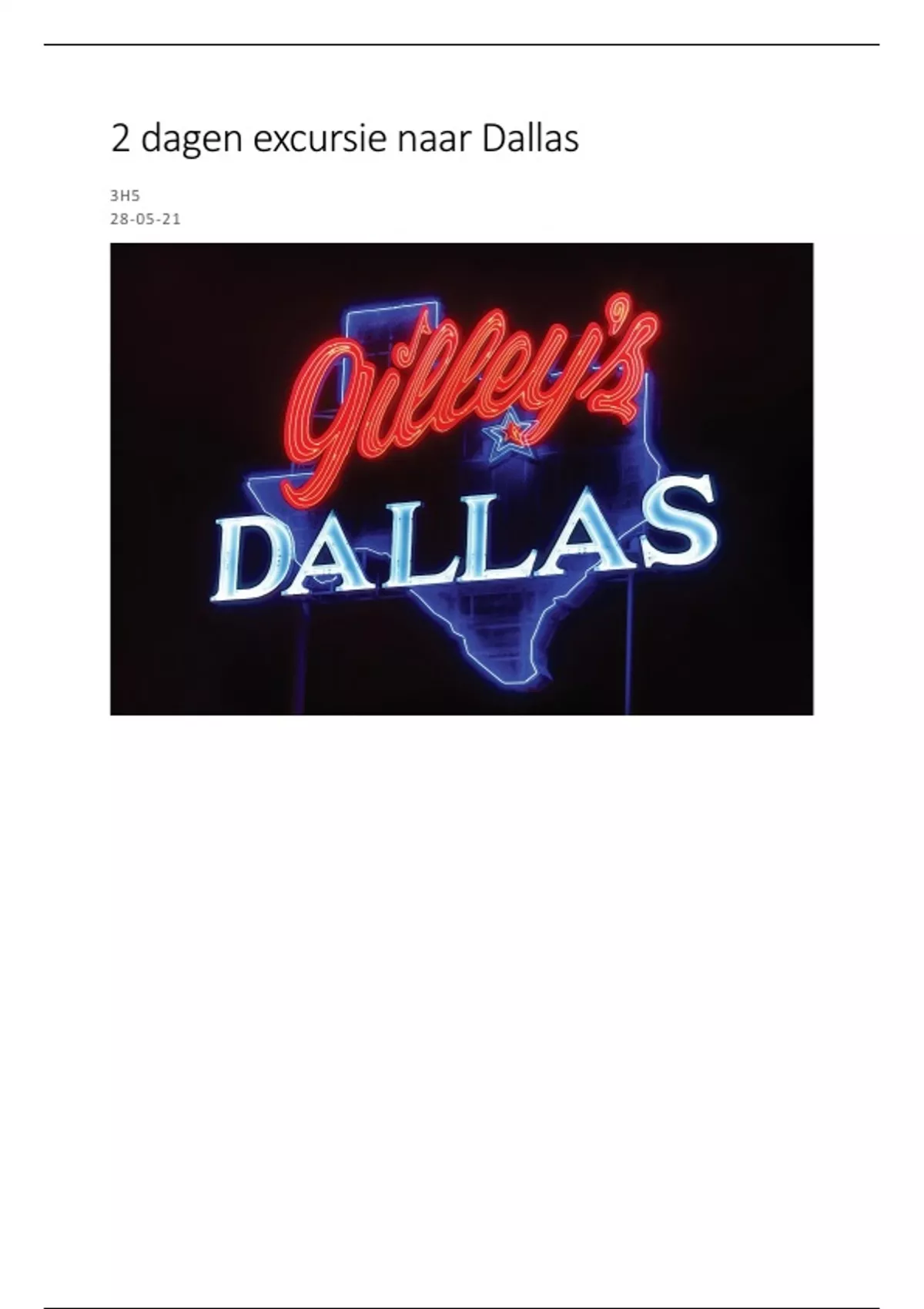 De opdracht was om een 2 daagse-trip naar Amerika te plannen. Deze trip gaat naar Texas en er komen punten zoals hotels, bezienswaardigheden en een tijdsplanning aan bod. Dus als je geen zin hebt om zelf een opdracht te maken of inspiratieloos bent is deze wat voor jou.