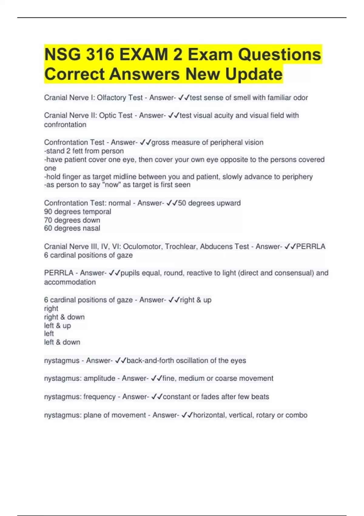 NSG 316 EXAM 2 Exam Questions Correct Answers New Update Cranial Nerve I: Olfactory Test - Answer- test sense of smell with familiar odor Cranial Nerve II: Optic Test - Answer- test visual acuity and visual field with confrontation Confrontation Test - Answer- gross measure of peripheral vision -stand 2 fett from person -have patient cover one eye, then cover your own eye opposite to the persons covered one -hold finger as target midline between you and patient, slowly advance to periphery -as person to say "now" as target is first seen Confrontation Test: normal - Answer- 50 degrees upward 90 degrees temporal 70 degrees down 60 degrees nasal Cranial Nerve III, IV, VI: Oculomotor, Trochlear, Abducens Test - Answer- PERRLA 6 cardinal positions of gaze PERRLA - Answer- pupils equal, round, reactive to light (direct and consensual) and accommodation 6 cardinal positions of gaze - Answer- right & up right right & down left & up left left & down nystagmus - Answer- back-and-forth oscillation of the eyes nystagmus: amplitude - Answer- fine, medium or coarse movement nystagmus: frequency - Answer- constant or fades after few beats nystagmus: plane of movement - Answer- horizontal, vertical, rotary or combo Cranial Nerve V: Trigeminal Test - Answer- Motor: asking the client to clench her teeth while you palpate the masseter (muscle of mastication) Sensory- test light touch by having a client closer their eyes while you toucher her face gently with a wisp of cotton, patient identifies location What does the corneal reflex test? - Answer- CN V sensory, CN VII motor Corneal reflex test - Answer- -remove contacts, bring cotton wisp from side, lightly touch cornea NORMALLY: patient blinks bilaterally Cranial Nerve VII: Facial Test - Answer- Motor: have client smile, frown, puff out her cheeks, raise her eyebrows, close her eyes tightly Sensory: anterior 2/3 taste (sugar, salt, lemon juice) Cranial Nerve VIII: Vestibulocochlear Test - Answer- Whispered voice test Cranial Nerve IX & X: Glossopharyngeal and Vagus Test - Answer- Motor: open mouth say "ahh" & gag reflex NORMALLY: uvula and soft palate rise in midline Sensory: CN IX does posterior 1/3 taste Cranial Nerve XI: Accessory Test - Answer- shrug shoulders Cranial Nerve XII: Hypoglossal Test - Answer- say "light, tight, dynamite" screening neuro exam - Answer- perform on well persons who have no significant subjective findings complete neuro exam - Answer- perform on person with neuro concerns neuro recheck exam - Answer- perform on person with demonstrated neuro defect, who requires period ic assessment ansomia - Answer- Decrease or loss of smell occurs bilaterally hemianopsia; hemianopia - Answer- Defective vision or blindness in one half of the visual field ptosis - Answer- drooping eyelid paresthesias - Answer- tingling, prickling, "pins & needles" (sensory loss) diplopia - Answer- double vision dysphagia - Answer- difficulty swallowing What are the test to evaluate cerebellar function? - Answer- Balance Test (Gait) Romberg Test Rapid Alternating Movements (RAM) Balance Test (Gait) - Answer- -observe as the person walks 10 to 20 feet, turns and returns to the starting point NORMALLY: gait is smooth, rhythmic and effortless opposing arm swing is coordinating Romberg test - Answer- -ask client to stand with feet at comfortable distance apart, arms at sides, and eyes closed for ~20 seconds NORMALLY: patient can maintain posture and balance Rapid Alternating Movements (RAM) - Answer- pat the knees with both hands, turn hands over, then faster NORMALLY: done with equal turning and quick rhythmic pace flaccidity - Answer- decreased muscle tone (hypotonia), muscle feels limp, soft, flabby spasticity - Answer- increased muscle tone (hypertonia) rigidity - Answer- constant state of resistance; resists passive movement in any direction (dystonia) cogwheel rigidity - Answer- Increased tone is released by degrees during passive range of motion so it feels like small, regular jerks. paralysis - Answer- decreased or loss of motor power hemiplegia - Answer- Spastic or flaccid paralysis of one side of the body paraplegia - Answer- symmetric paralysis of both lower extremities quadriplegia - Answer- paralysis of all four extremities paresis - Answer- weakness of muscles rather than paralysis tic - Answer- involuntary, compulsive, repetitive twitching of a muscle group myoclonus - Answer- Rapid, sudden jerk or a short series of jerks at fairly regular intervals. (ex: hiccup)