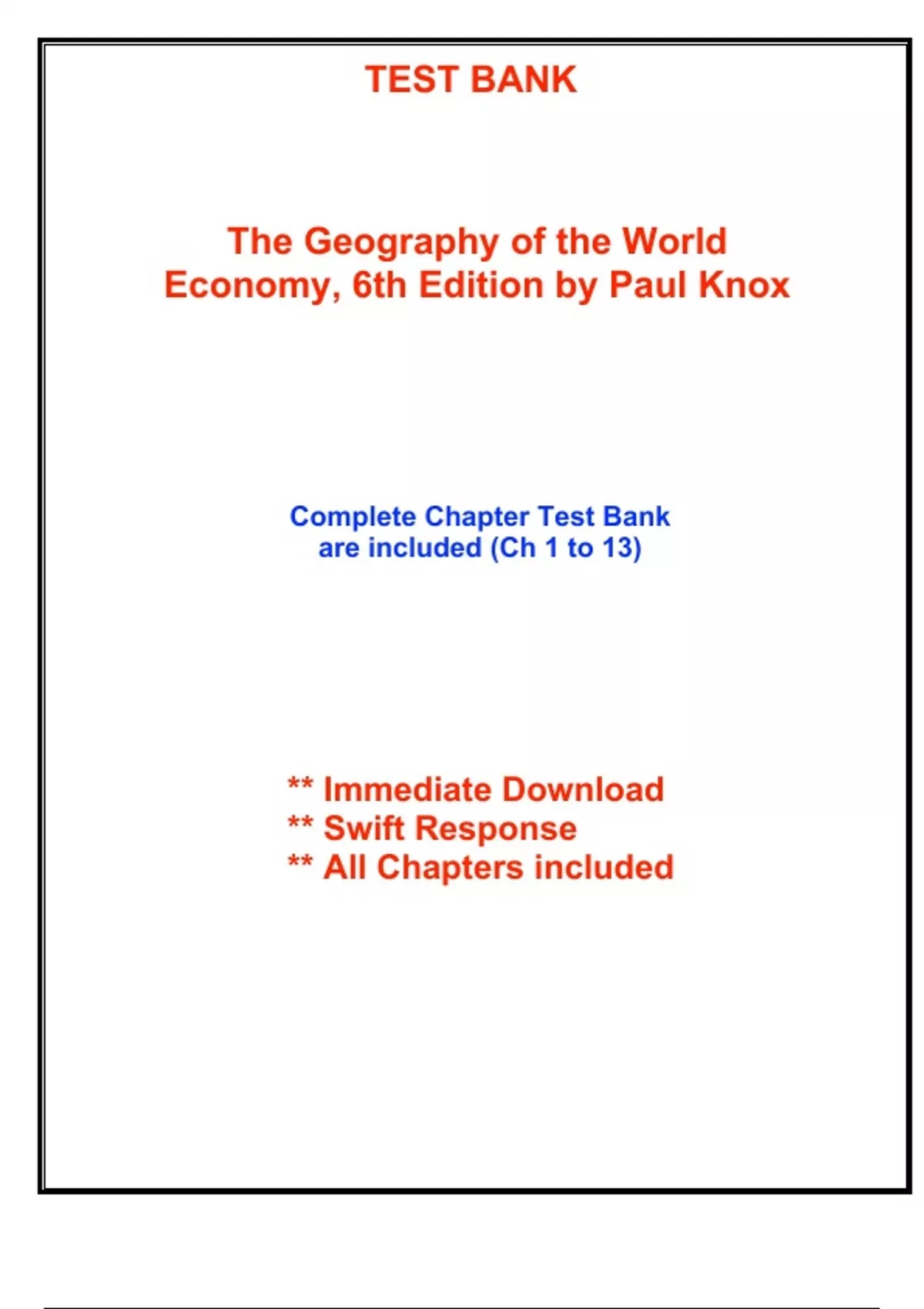 Complete Test Bank for The Geography of the World Economy, 6th Edition by Paul Knox, John Agnew, Linda Mccarthy ; ISBN13: 9781444184709...(Full Chapters included and organized in reverse order from Chapter 13 to 1)...1. The Changing World Economy 2. Global Patterns and Trends 3. Geographical Dynamics of the World Economy 4. Pre-industrial Foundations 5. Evolution of the Core Regions 6. Globalization of Economic Activities 7. Spatial Reorganization of the Core Economies 8. Dynamics of Interdependence: Transformation of the Periphery 9. Agriculture: The Primary Concern 10. Industrialization: The Path to Progress? 11. Services: Going Global? 12. International and Supranational Institutionalized Integration 13. Reassertion of the Local in the Age of the Global: Regions and Localities Within the World Economy