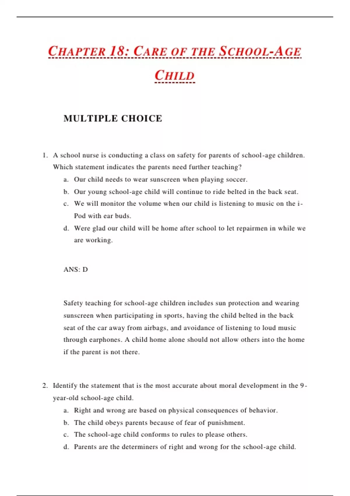 MULTIPLE CHOICE 1. A school nurse is conducting a class on safety for parents of school-age children. Which statement indicates the parents need further teaching? a. Our child needs to wear sunscreen when playing soccer. b. Our young school-age child will continue to ride belted in the back seat. c. We will monitor the volume when our child is listening to music on the i-Pod with ear buds. d. Were glad our child will be home after school to let repairmen in while we are working. ANS: D Safety teaching for school-age children includes sun protection and wearing sunscreen when participating in sports, having the child belted in the back seat of the car away from airbags, and avoidance of listening to loud music through earphones. A child home alone should not allow others into the home if the parent is not there. 2. Identify the statement that is the most accurate about moral development in the 9-year-old school-age child. a. Right and wrong are based on physical consequences of behavior. b. The child obeys parents because of fear of punishment. c. The school-age child conforms to rules to please others. d. Parents are the determiners of right and wrong for the school-age child. ANS: C The 7- to 12-year-old child bases right and wrong on a good-boy or good-girl orientation in which the child conforms to rules to please others and avoid disapproval. Children 4 to 7 years of age base right and wrong on consequences; consequences are the most important consideration for the child between 4 and 7 years of age. Parents determine right and wrong for the child younger than 4 years of age. 3. Which parental behavior is the most important in fostering moral development? a. Telling the child what is right and wrong b. Vigilantly monitoring the child and her peers c. Weekly family meetings to discuss behavior d. Living as the parents say they believe