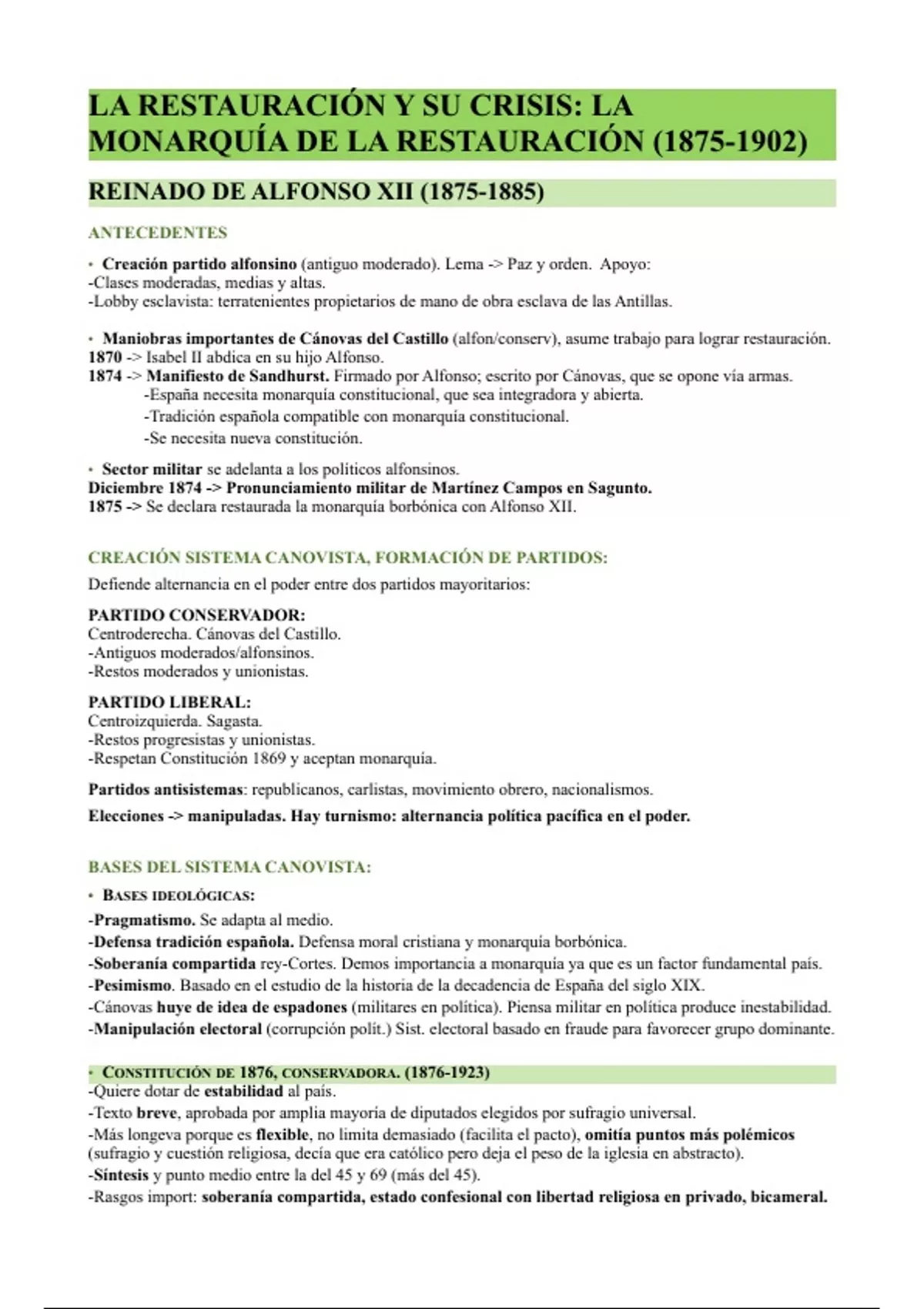 Sist. bipartidista bajo dominio Conservador (Cánovas, centroderecha); Liberal (Sagasta, centroizquierda).