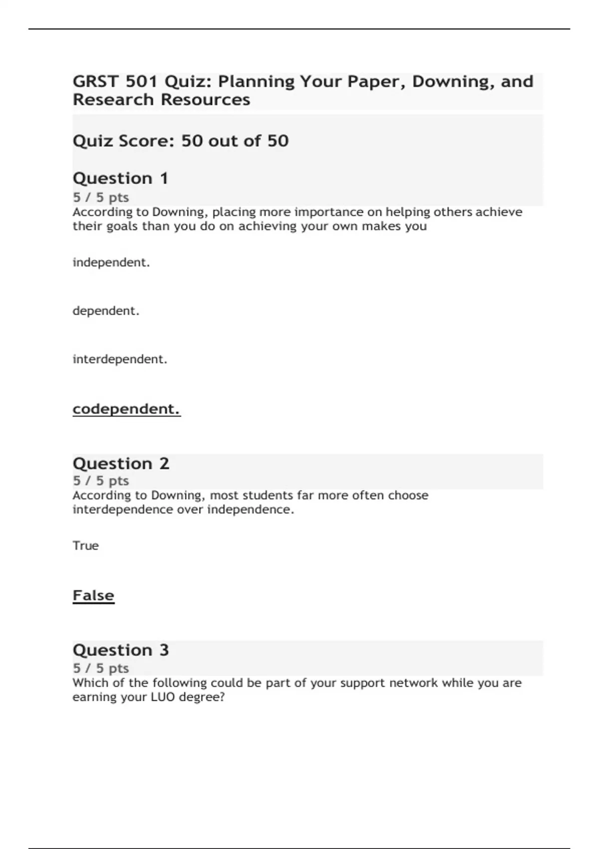 GRST 501 Quiz: Planning Your Paper, Downing, and