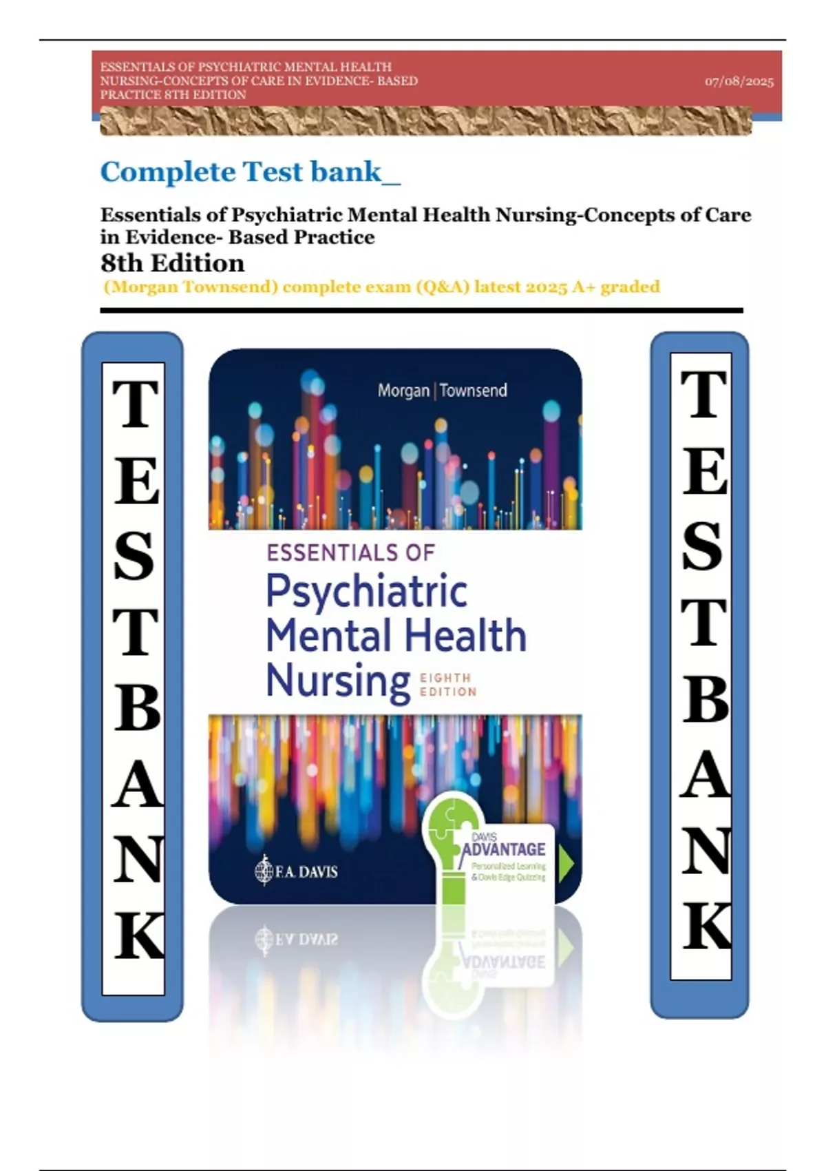Essentials of Psychiatric Mental Health Nursing-Concepts of Care in Evidence- Based Practice 8th Edition (Morgan Townsend) complete exam (Q&A) latest 2025 A+ graded This document contains a complete collection of exam questions and answers based on the 8th edition of Essentials of Psychiatric Mental Health Nursing: Concepts of Care in Evidence-Based Practice by Morgan Townsend. It covers all major chapters and key concepts relevant to psychiatric nursing, including therapeutic communication, disorders, pharmacology, and crisis intervention. Perfect for 2025 exam prep, this resource reflects the latest curriculum and clinical practice standards