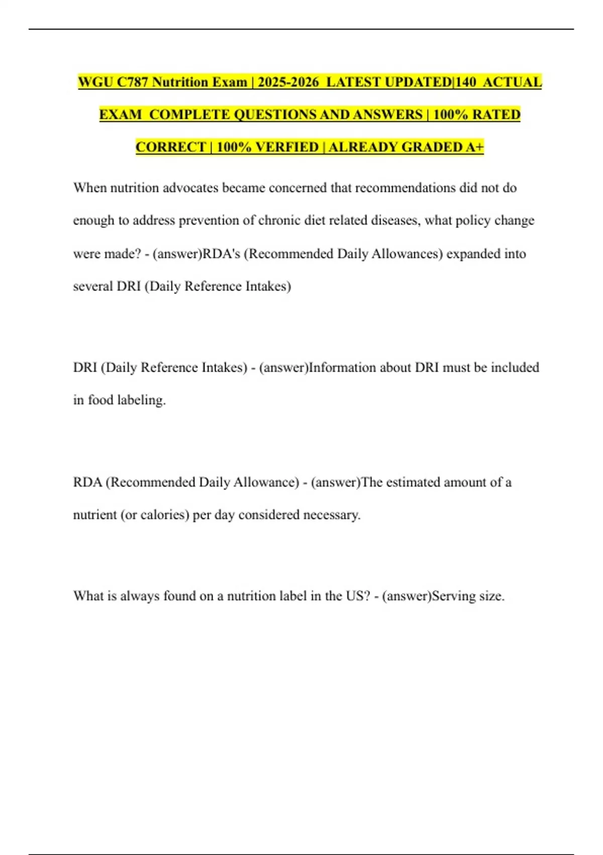 WGU C787 Nutrition Exam | LATEST UPDATED|140 ACTUAL EXAM COMPLETE QUESTIONS AND ANSWERS | 100% RATED CORRECT | 100% VERFIED | ALREADY GRADED A+