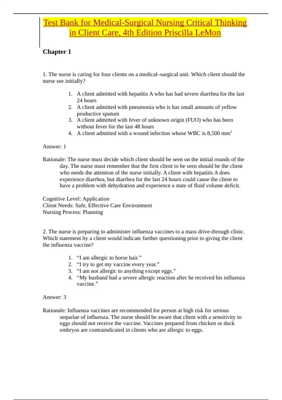 Chapter 1 1. The nurse is caring for four clients on a medical–surgical unit. Which client should the nurse see initially? 1. A client admitted with hepatitis A who has had severe diarrhea for the last 24 hours 2. A client admitted with pneumonia who is has small amounts of yellow productive sputum 3. A client admitted with fever of unknown origin (FUO) who has been without fever for the last 48 hours 4. A client admitted with a wound infection whose WBC is 8,500 mm3 Answer: 1 Rationale: The nurse must decide which client should be seen on the initial rounds of the day. The nurse must remember that the first client to be seen should be the client who needs the attention of the nurse initially. A client with hepatitis A does experience diarrhea, but diarrhea for the last 24 hours could cause the client to have a problem with dehydration and experience a state of fluid volume deficit. Cognitive Level: Application Client Needs: Safe, Effective Care Environment Nursing Process: Planning 2. The nurse is preparing to administer influenza vaccines to a mass drive-through clinic. Which statement by a client would indicate further questioning prior to giving the client the influenza vaccine? 1. “I am allergic to horse hair.” 2. “I try to get my vaccine every year.” 3. “I am not allergic to anything except eggs.” 4. “My husband had a severe allergic reaction after he received his influenza vaccine.” Answer: 3 Rationale: Influenza vaccines are recommended for person at high risk for serious sequelae of influenza. The nurse should be aware that client with a sensitivity to eggs should not receive the vaccine. Vaccines prepared from chicken or duck embryos are contraindicated in clients who are allergic to eggs.