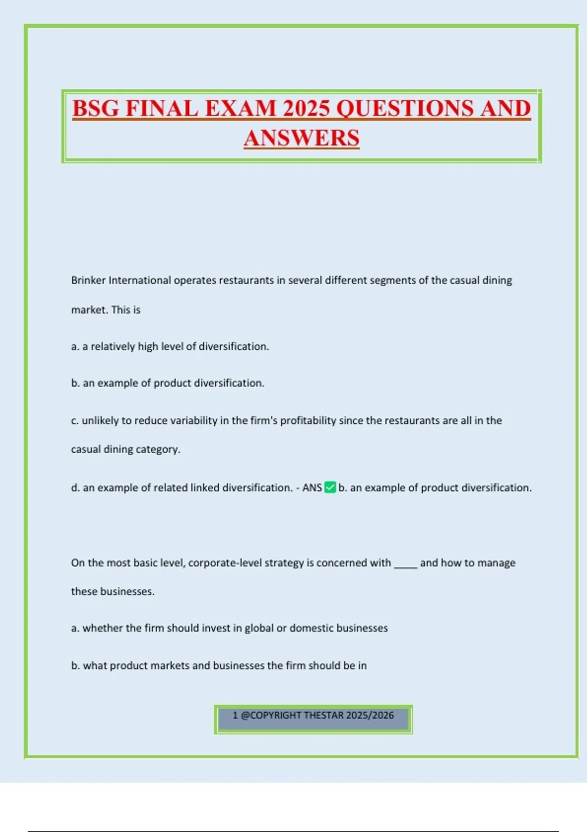 Brinker International operates restaurants in several different segments of the casual dining market. This is a. a relatively high level of diversification. b. an example of product diversification. c. unlikely to reduce variability in the firm's profitability since the restaurants are all in the casual dining category. d. an example of related linked diversification. - ANS b. an example of product diversification. On the most basic level, corporate-level strategy is concerned with ____ and how to manage these businesses. a. whether the firm should invest in global or domestic businesses b. what product markets and businesses the firm should be in BSG FINAL EXAM 2025 QUESTIONS AND ANSWERS 2 @COPYRIGHT THESTAR 2025/2026 c. whether the portfolio of businesses should generate immediate above-average returns or should be troubled businesses which will create above-average returns only after restructuring d. whether to integrate backward or forward. - ANS b. what product markets and businesses the firm should be in Which acquisition would be considered the LEAST related? a. a candy manufacturer purchases a chemical laboratory specializing in food flavorings. b. a chain of garden centers acquires a landscape architecture firm. c. a hospital acquires a long-term care nursing home. d. an upscale "white-tablecloth" restaurant chain acquires a travel agency - ANS d. an upscale "white-tablecloth" restaurant chain acquires a travel agency The more "constrained" the relatedness of diversification, a. the less likely the firm's portfolio of businesses will reduce the firm's variability in profitability. b. the wider the variation in the portfolio of businesses owned by the firm. c. the more links there are among the businesses owned by an organization. 3 @COPYRIGHT THESTAR 2025/2026 d. lower the proportion of total organizational revenue derived from the dominant-business. - ANS c. the more links there are among the businesses owned by an organization. Which of the following is NOT a limit to vertical integration? a. bureaucratic costs b. the loss of flexibility through investment in specific technologies c. capacity balance and coordination problems from changes in demand d. imitation of core technology by potential competitors - ANS d. imitation of core technology by potential competitors Horizontal acquisitions in the video rental industry are typically intended to a. take advantage of innovations created by the other firm. b. reduce some of the overcapacity in the industry. c. control more parts of the value chain. d. overcome barriers to entry - ANS b. reduc