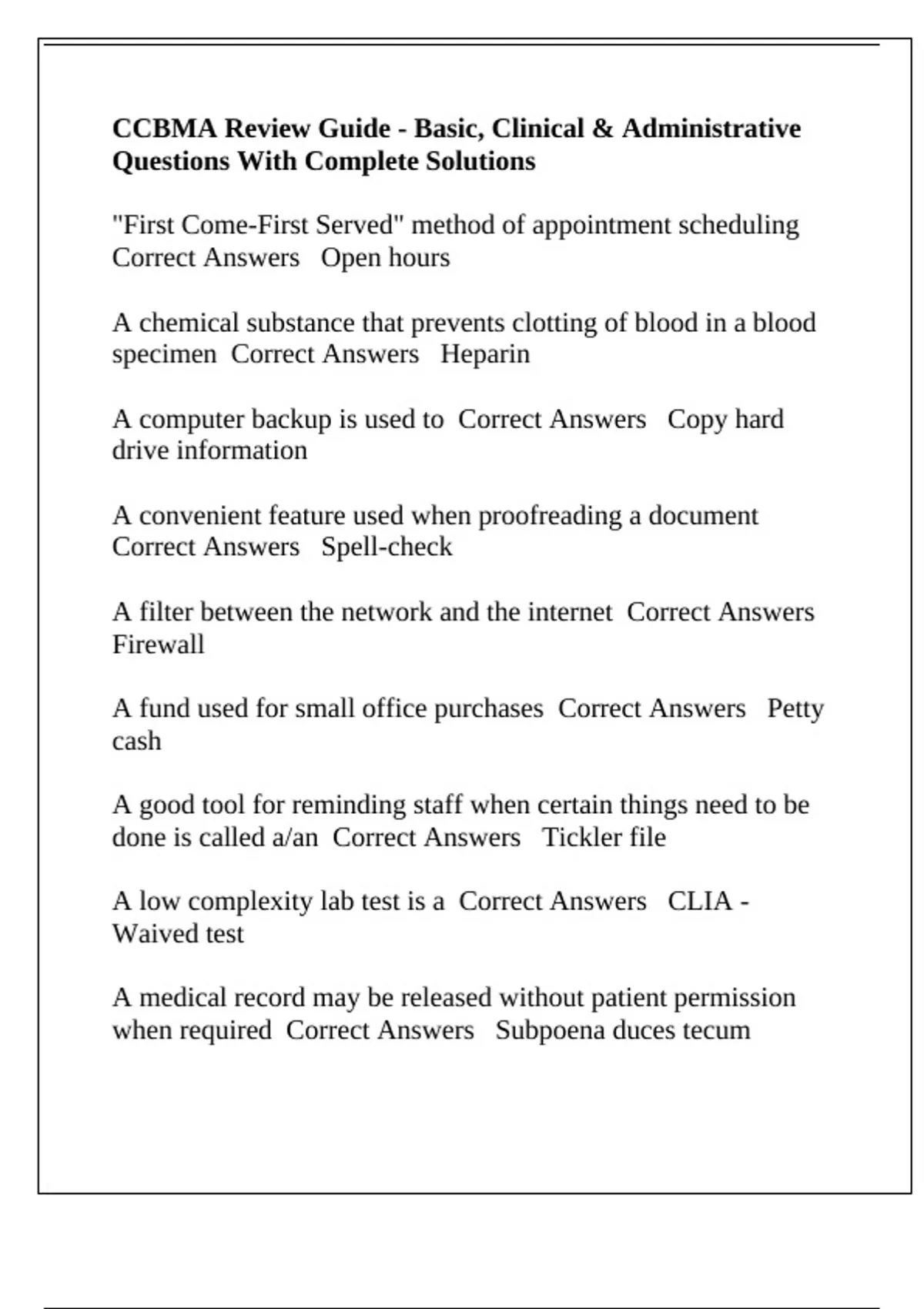 specimen Correct Answers Heparin
