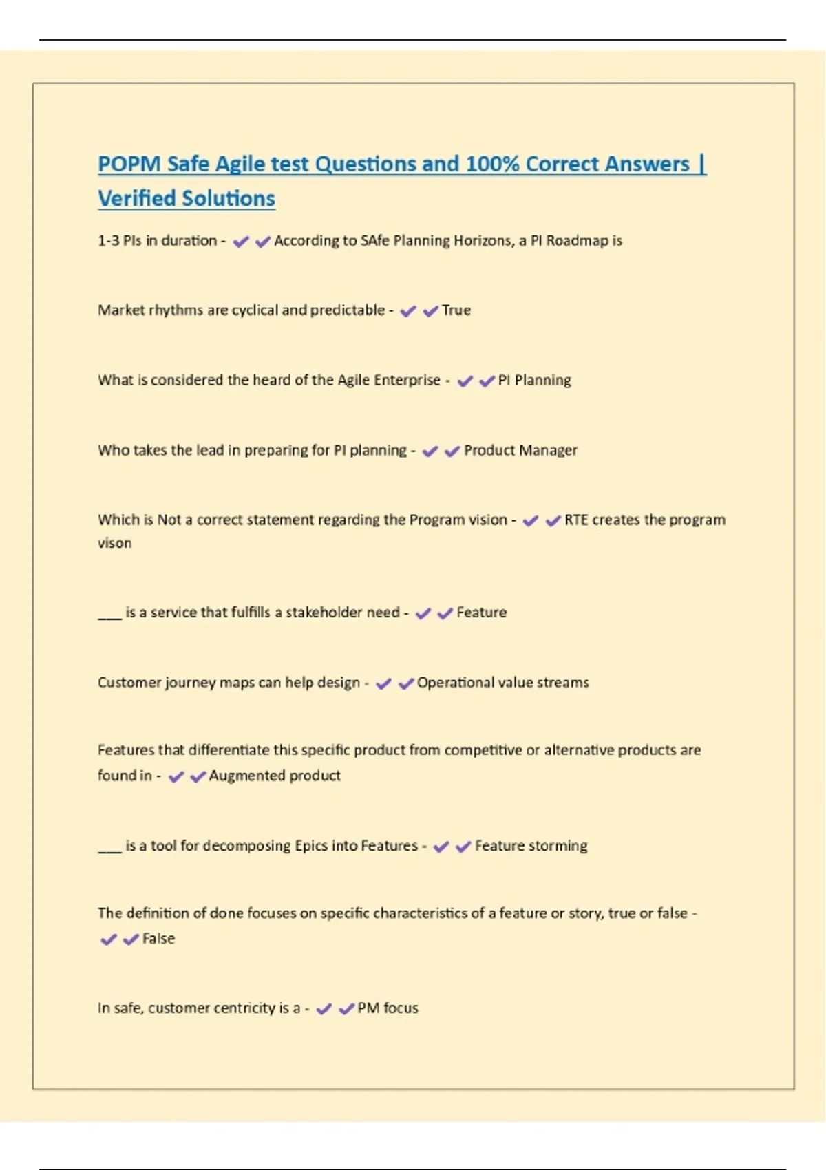 POPM Safe Agile test Questions and 100% Correct Answers | Verified Solutions