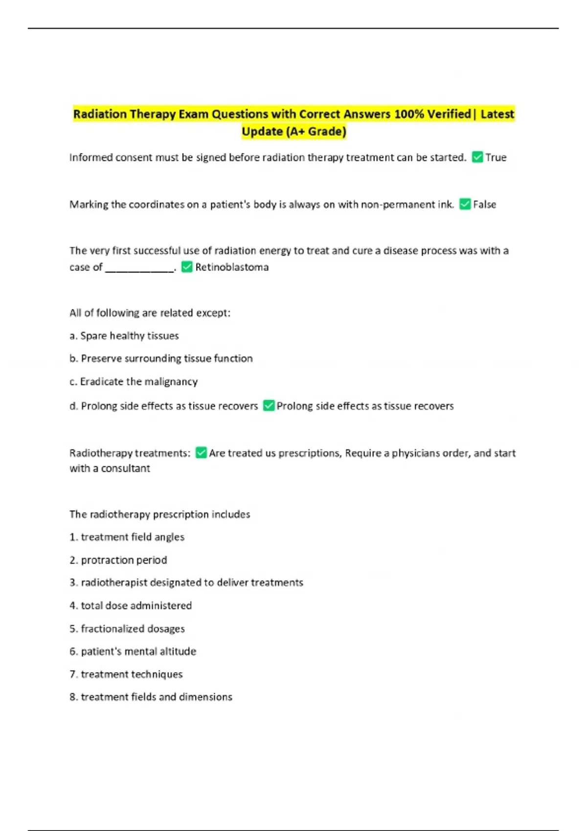Radiation Therapy Exam Questions with Correct Answers 100% Verified| Latest Update (A+ Grade)