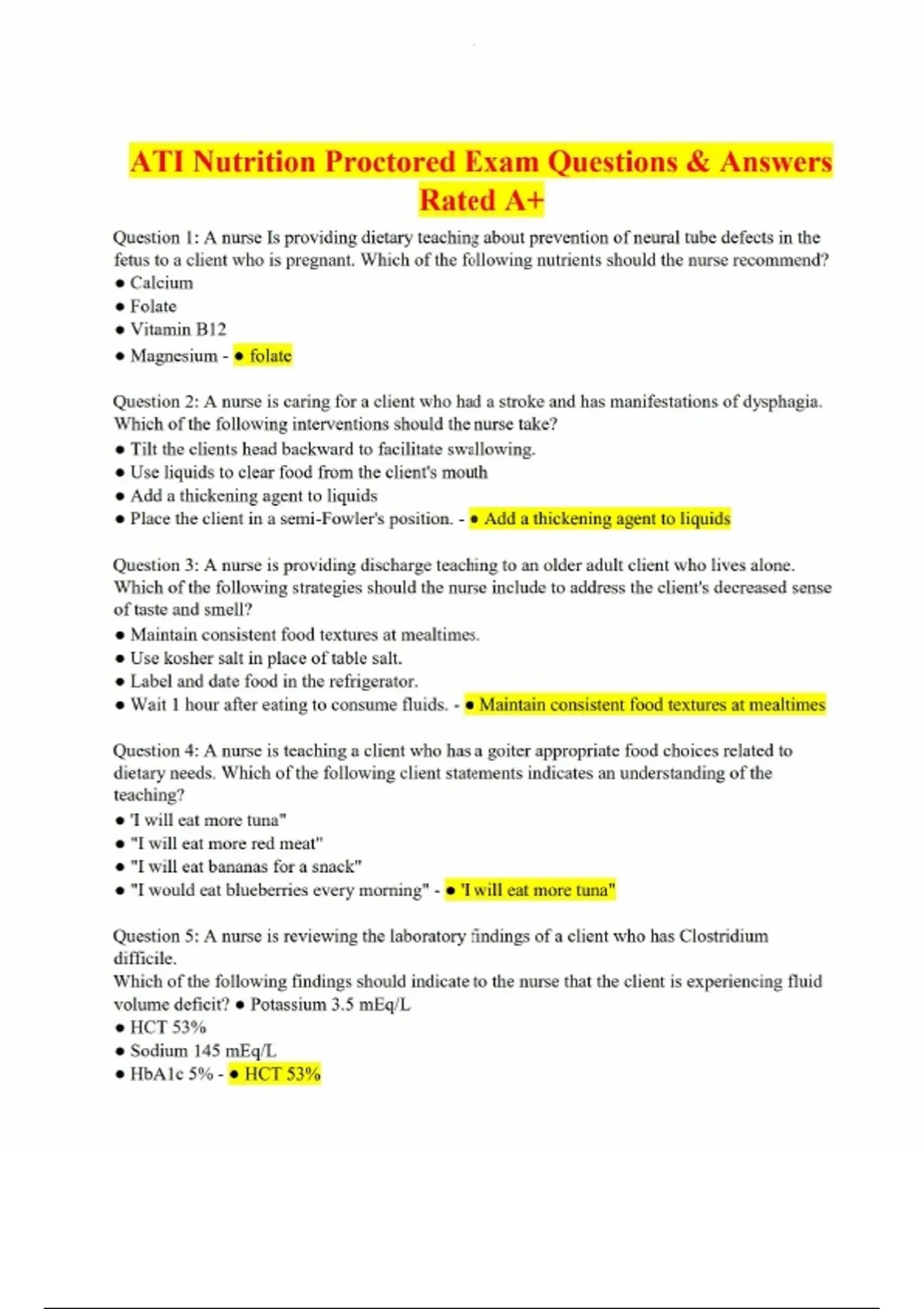 ATI Nutrition Proctored Exam Questions & Answers Rated A+,Question 1: A nurse Is providing dietary teaching about prevention of neural tube defects in the fetus to a client who is pregnant. Which of the following nutrients should the nurse recommend? ● Calcium ● Folate ● Vitamin B12 ● Magnesium - ● folate Question 2: A nurse is caring for a client who had a stroke and has manifestations of dysphagia. Which of the following interventions should the nurse take? ● Tilt the clients head backward to facilitate swallowing. ● Use liquids to clear food from the client's mouth ● Add a thickening agent to liquids ● Place the client in a semi-Fowler's position. - ● Add a thickening agent to liquids Question 3: A nurse is providing discharge teaching to an older adult client who lives alone. Which of the following strategies should the nurse include to address the client's decreased sense of taste and smell? ● Maintain consistent food textures at mealtimes. ● Use kosher salt in place of table salt. ● Label and date food in the refrigerator. ● Wait 1 hour after eating to consume fluids. - ● Maintain consistent food textures at mealtimes Question 4: A nurse is teaching a client who has a goiter appropriate food choices related to dietary needs. Which of the following client statements indicates an understanding of the teaching? ● 'I will eat more tuna" ● "I will eat more red meat" ● "I will eat bananas for a snack" ● "I would eat blueberries every morning" - ● 'I will eat more tuna" Question 5: A nurse is reviewing the laboratory findings of a client who has Clostridium difficile. Which of the following findings should indicate to the nurse that the client is experiencing fluid volume deficit? ● Potassium 3.5 mEq/L ● HCT 53% ● Sodium 145 mEq/L ● HbA1c 5% - ● HCT 53% Question 6: A client in the oliguric phase of acute renal failure had a urinary output of 420 ml during the preceding 24-hour period. How much fluid should the nurse plan to provide the client over the next 24 hr? ● 2,550 ml ● 1,530 ml ● 920 ml ● 2,040 ml - ● 920 ml Question 7: A nurse is teaching a client ways to manage anorexia while receiving radiation therapy. Which of the following instructions should the nurse include in the teaching? ● "Limit High-kilocalorie supplements to between meals." ● "Eat hot food rather than cold foods." ● "Avoid overeating during "good" days." ● "Consume nutrition-dense foods first." - ● "Consume nutrition-dense foods first." Question 8: A nurse is teaching a client who is receiving bolus feeding through a nasogastric tube about dumping syndrome. The nurse should instruct the client to report which of the following manifestations? ● Constipation ● Bradycardia ● Drowsiness ● Dizziness - ●Bradycardia Question 9: A client is receiving a thiazide diuretic for treatment of hypertension. Which of the following foods selected by the client reflects understanding of the nurses teaching regarding this medication? ● Navy beans and ham ● Baked potato ● Cheddar cheese ● Beef broth - ● Baked potato Question 10: A nurse is teaching about nutrition to a client who has a new diagnosis of chronic kidney disease. Which of the following recommendations should the nurse include in the teaching? ● Limit calcium intake ● Increase potassium intake ● Limit protein intake ● Increase phosphorus intake - ● Limit protein intake Question 11: A nurse is caring for a client who has stomatitis following radiation therapy. Which of the following interventions is appropriate for the nurse to take? ● Discourage the use of a straw. ● Offer the client frozen bananas as a snack. ● Serve the client hot meals. ● Avoid serving sauces or gravies. - ● Offer the client frozen bananas as a snack A nurse is teaching the Guardians of a school-age child about nutrition. Which of the following statements should the nurse make? ● You should have your child skip breakfast ● You should eat meals together most of the time ● You should provide your child with whole fat milk ● You should reward good behavior with food - ● You should eat meals together most of the time Question 13: A nurse is assessing an older adult client who has dysphagia and is experiencing dehydration. Which of the following findings should the nurse expect? ● Tachycardia ● Distended neck veins ● Decrease respiratory rate ● Hypertension - ● Tachycardia