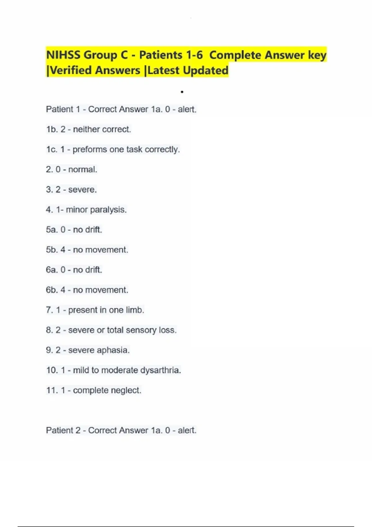 NIHSS Group C - Patients 1-6 Complete Answer key |Verified Answers |Latest Updated