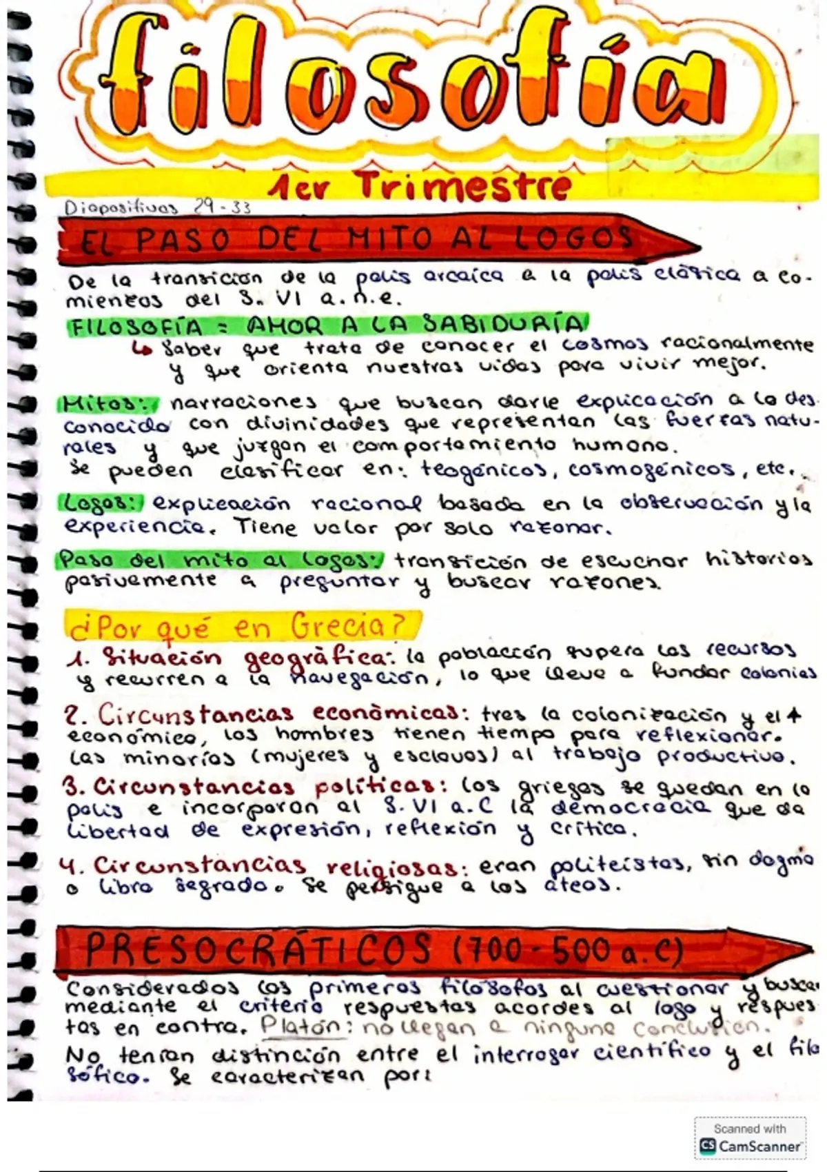 En el presente documento encontraras diversas comparaciones, explicaciones, metáforas y recursos filósoficos utilizados por los autores que se incluyen en el documento para explicar razones filosóficas básicas. Habla del origen de la filosofía, la cuestión del arjé, separación cuerpo/alma, physis vs nomos, método dialéctico + intelectualismo moral, y la políticas según los autores.
