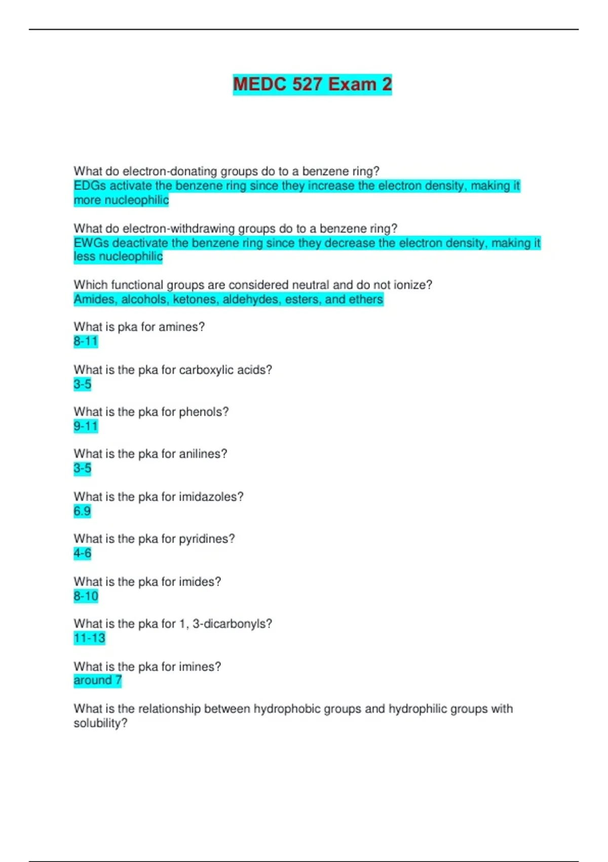 MEDC 527 Exam 2 | Questions and Answers What do electron-donating groups do to a benzene ring? EDGs activate the benzene ring since they increase the electron density, making it more nucleophilic What do electron-withdrawing groups do to a benzene ring? EWGs deactivate the benzene ring since they decrease the electron density, making it less nucleophilic Which functional groups are considered neutral and do not ionize? Amides, alcohols, ketones, aldehydes, esters, and ethers What is pka for amines? 8-11 What is the pka for carboxylic acids? 3-5 What is the pka for phenols? 9-11 What is the pka for anilines? 3-5 What is the pka for imidazoles? 6.9 What is the pka for pyridines? 4-6 What is the pka for imides? 8-10 What is the pka for 1, 3-dicarbonyls? 11-13 What is the pka for imines? around 7 What is the relationship between hydrophobic groups and hydrophilic groups with solubility? Hydrophobic groups would decrease the solubility of the molecule; meanwhile, hydrophilic groups would increase the solubility of the molecule. What are the hydrophilic groups? -OH, -NH2, -COOH, -CONH2 What are the hydrophobic groups? Aromatic rings, long chains How can amines become more soluble? Aqueous mineral acids make the amines into an ionic salt group, making it soluble. Meanwhile, carboxylic acids, when combined with an amine group, create an amine-carboxylate salt, which is soluble. Which amino acids are non-polar with aliphatic r-groups? Glycine, Alanine, Proline, Valine, Leucine, Isoleucine, Methionine Chemical structure of glycine