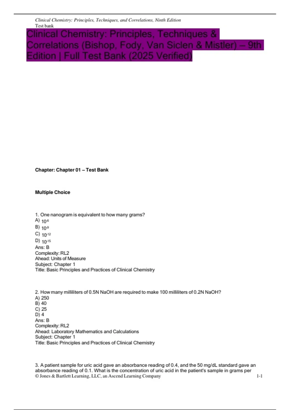 This Clinical Chemistry Test Bank (9th Edition) provides laboratory science and medical students with a reliable exam preparation tool. Covering principles, instrumentation, biochemical testing, and clinical correlations, it is tailored for students in medical laboratory science and clinical diagnostics. Updated for 2025, the verified questions reflect the latest standards and prepare students for classroom assessments, certification exams, and professional practice. With complete rationales, this test bank helps learners understand laboratory results in the context of patient care, reinforcing both theoretical knowledge and applied clinical skills.