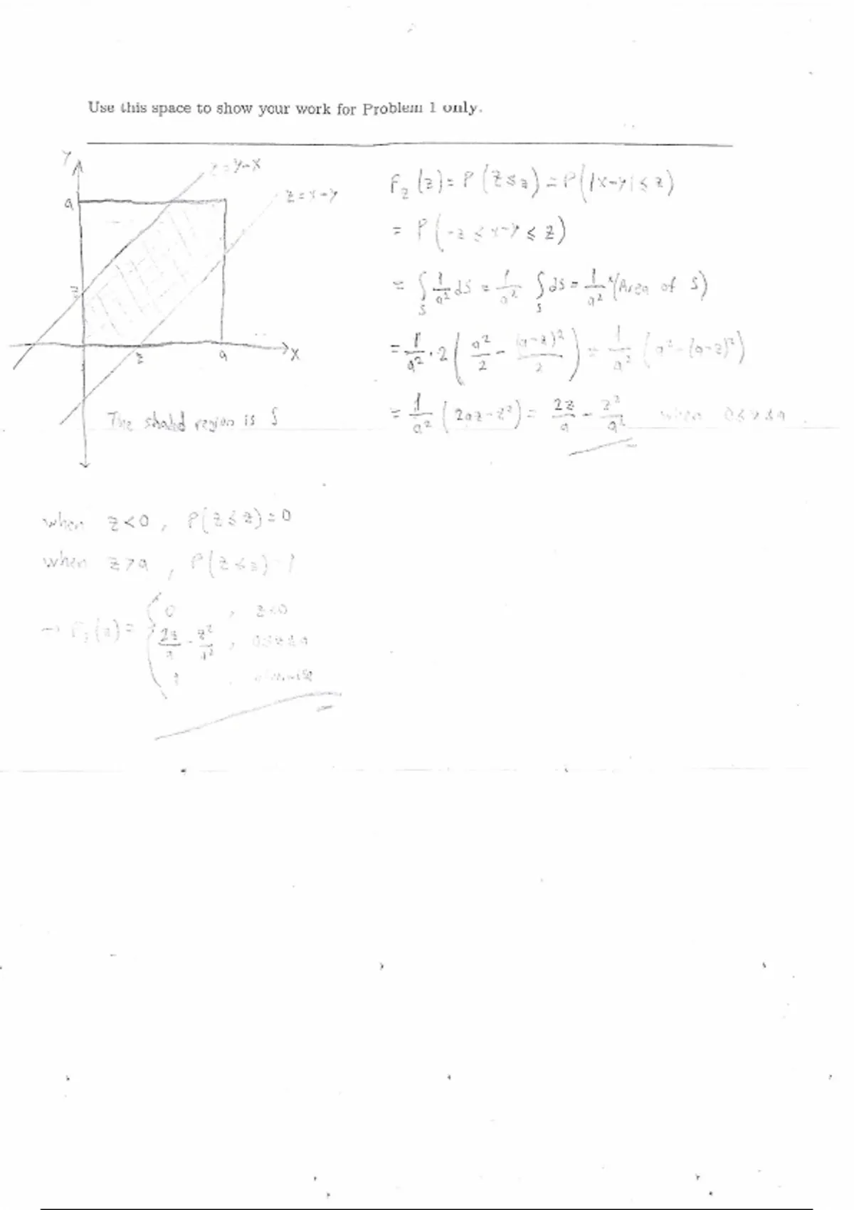 P1. (5 points) Let X and Y be two independent drawings from the uniform distribution on [0, a], with a > 0 a given constant. Let Z = X -Y| be the distance between the two points. Find the CDF Fz(z). Show your work by drawing a figure that explains how you calculate Fz(z). 2<0 27 22 Fz(z) = a 92 05259 279 Use this space to show your work for Problem 2 only. S1, if the ith dight drawn is Xi= (o, otheri 7 =) mean of 4th4xyt--+ Xpgon0 10008 (mgon ot X;) 10,00*= 1000 =EEY] ) vaviance of *it2txyt +es 10000* var (Y:) = 10000" -) By. CLT, J/ 968-1000 く =1-3) =1-3 (103) 21-8(107) =1-0.8577:0.1003 오 30 367°00/-100о Nok: we coull use I or even e