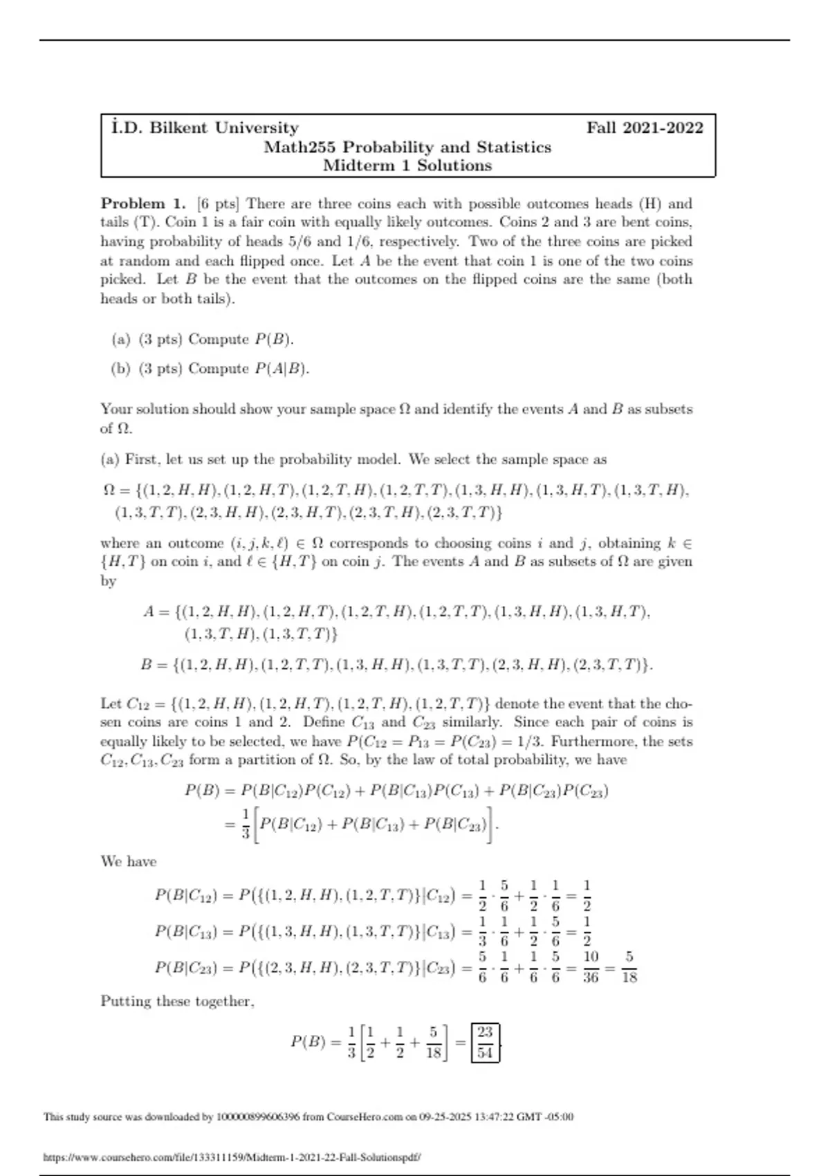 Bilkent University Fall Math255 Probability and Statistics Midterm 1 Solutions Problem 1. [6 pts] There are three coins each with possible outcomes heads (H) and tails (T). Coin 1 is a fair coin with equally likely outcomes. Coins 2 and 3 are bent coins, having probability of heads 5/6 and 1/6, respectively. Two of the three coins are picked at random and each flipped once. Let A be the event that coin 1 is one of the two coins picked. Let B be the event that the outcomes on the flipped coins are the same (both heads or both tails). (a) (3 pts) Compute P(B). (b) (3 pts) Compute P(A|B). Your solution should show your sample space Ω and identify the events A and B as subsets of Ω. (a) First, let us set up the probability model. We select the sample space as Ω = {(1, 2, H, H),(1, 2, H, T),(1, 2, T, H),(1, 2, T, T),(1, 3, H, H),(1, 3, H, T),(1, 3, T, H), (1, 3, T, T),(2, 3, H, H),(2, 3, H, T),(2, 3, T, H),(2, 3, T, T)} where an outcome (i, j, k, `) ∈ Ω corresponds to choosing coins i and j, obtaining k ∈ {H, T} on coin i, and ` ∈ {H, T} on coin j. The events A and B as subsets of Ω are given by A = {(1, 2, H, H),(1, 2, H, T),(1, 2, T, H),(1, 2, T, T),(1, 3, H, H),(1, 3, H, T), (1, 3, T, H),(1, 3, T, T)} B = {(1, 2, H, H),(1, 2, T, T),(1, 3, H, H),(1, 3, T, T),(2, 3, H, H),(2, 3, T, T)}. Let C12 = {(1, 2, H, H),(1, 2, H, T),(1, 2, T, H),(1, 2, T, T)} denote the event that the chosen coins are coins 1 and 2. Define C13 and C23 similarly. Since each pair of coins is equally likely to be selected, we have P(C12 = P13 = P(C23) = 1/3. Furthermore, the sets C12, C13, C23 form a partition of Ω. So, by the law of total probability, we have P(B) = P(B|C12)P(C12) + P(B|C13)P(C13) + P(B|C23)P(C23) = 1 3  P(B|C12) + P(B|C13) + P(B|C23)  . We have P(B|C12) = P {(1, 2, H, H),(1, 2, T, T)} C12 = 1 2 · 5 6 + 1 2 · 1 6 = 1 2 P(B|C13) = P {(1, 3, H, H),(1, 3, T, T)} C13 = 1 3 · 1 6 + 1 2 · 5 6 = 1 2 P(B|C23) = P {(2, 3, H, H),(2, 3, T, T)} C23 = 5 6 · 1 6 + 1 6 · 5 6 = 10 36 = 5 18 Putting these together, P(B) = 1 3  1 2 + 1 2 + 5 18 = 23 54 . This study source was downloaded by from CourseH on