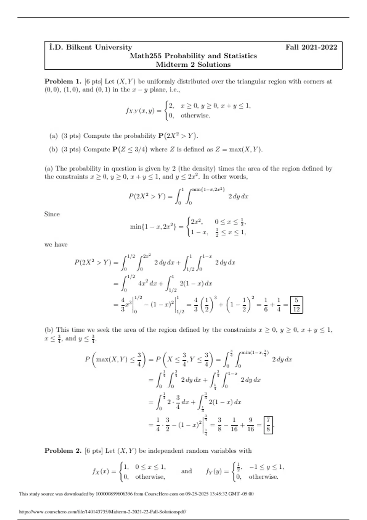 Bilkent University Fall Math255 Probability and Statistics Midterm 2 Solutions Problem 1. [6 pts] Let (X, Y ) be uniformly distributed over the triangular region with corners at (0, 0), (1, 0), and (0, 1) in the x − y plane, i.e., fX,Y (x, y) = ( 2, x ≥ 0, y ≥ 0, x + y ≤ 1, 0, otherwise. (a) (3 pts) Compute the probability P 2X2 > Y  . (b) (3 pts) Compute P Z ≤ 3/4  where Z is defined as Z = max(X, Y ). (a) The probability in question is given by 2 (the density) times the area of the region defined by the constraints x ≥ 0, y ≥ 0, x + y ≤ 1, and y ≤ 2x 2 . In other words, P(2X2 > Y ) = Z 1 0 Z min{1−x,2x 2} 0 2 dy dx Since min{1 − x, 2x 2 } = ( 2x 2 , 0 ≤ x ≤ 1 2 , 1 − x, 1 2 ≤ x ≤ 1, we have P(2X2 > Y ) = Z 1/2 0 Z 2x 2 0 2 dy dx + Z 1 1/2 Z 1−x 0 2 dy dx = Z 1/2 0 4x 2 dx + Z 1 1/2 2(1 − x) dx = 4 3 x 3 1/2 0 − (1 − x) 2 1 1/2 = 4 3  1 2 3 +  1 − 1 2 2 = 1 6 + 1 4 = 5 12 (b) This time we seek the area of the region defined by the constraints x ≥ 0, y ≥ 0, x + y ≤ 1, x ≤ 3 4 , and y ≤ 3 4 . P  max(X, Y ) ≤ 3 4  = P  X ≤ 3 4 , Y ≤ 3 4  = Z 3 4 0 Z min(1−x, 3 4 ) 0 2 dy dx = Z 1 4 0 Z 3 4 0 2 dy dx