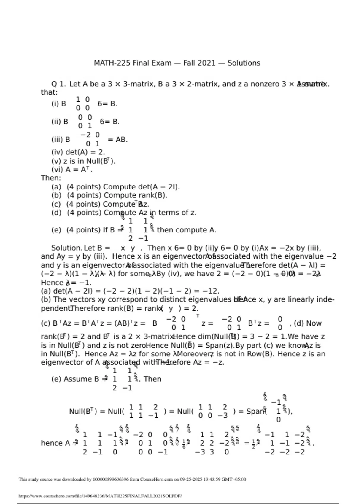 MATH-225 Final Exam — Fall 2021 — Solutions Q 1. Let A be a 3 × 3-matrix, B a 3 × 2-matrix, and z a nonzero 3 × 1-matrix. Assume that: (i) B 1 0 0 0 6= B. (ii) B 0 0 0 1 6= B. (iii) B −2 0 0 1 = AB. (iv) det(A) = 2. (v) z is in Null(B T ). (vi) A = AT . Then: (a) (4 points) Compute det(A − 2I). (b) (4 points) Compute rank(B). (c) (4 points) Compute BTAz. (d) (4 points) Compute Az in terms of z. (e) (4 points) If B =   1 1 1 1 2 −1   then compute A. Solution. Let B = x y . Then x 6= 0 by (ii),y 6= 0 by (i),Ax = −2x by (iii), and Ay = y by (iii). Hence x is an eigenvector of A associated with the eigenvalue −2 and y is an eigenvector of A associated with the eigenvalue 1. Therefore det(A − λI) = (−2 − λ)(1 − λ)(0λ− λ) for some0 λ. By (iv), we have 2 = (−2 − 0)(1 −0 0)( − 0) =λ −20λ. Hence λ0 = −1. (a) det(A − 2I) = (−2 − 2)(1 − 2)(−1 − 2) = −12. (b) The vectors xy, correspond to distinct eigenvalues of Hence A. x, y are linearly independent.Therefore rank(B) = rank(x y ) = 2. (c) BTAz = BTA T z = (AB) T z = B −2 0 0 1 T z = −2 0 0 1 B T z = 0 0 , (d) Now rank(B T ) = 2 and BT is a 2 × 3-matrix.Hence dim(Null(B T )) = 3 − 2 = 1.We have z is in Null(B T ) and z is not zero.Hence Null(B T ) = Span(z).By part (c) we know,Az is in Null(B T ). Hence Az = λz for some λMoreover, . z is not in Row(B). Hence z is an eigenvector of A associated withTherefore −1. Az = −z. (e) Assume B =   1 1 1 1 2 −1   . Then Null(B T ) = Null( 1 1 2 1 1 −1 ) = Null( 1 1 2 0 0 −3 ) = Span(   −1 1 0   ), hence A =   1 1 −1 1 1 1 2 −1 0     −2 0 0 0 1 0 0 0 −1     1 6   1 1 2 2 2 −2 −3 3 0     = 1 2   −1 1 −2 1 −1 −2 −2 −2 −2   . This study source was downloaded by from CourseH on :43:59 GMT -05:00 Q 2. (20 points) Solve the following first order ODE for1 e . y > 1 +x y dy dx + 1 + ln(y) = 0. Solution.The given Diff.Eq is not in a linear from inHowever, one can interchange y(x). the variables x and y, i.e x = xInterchangin