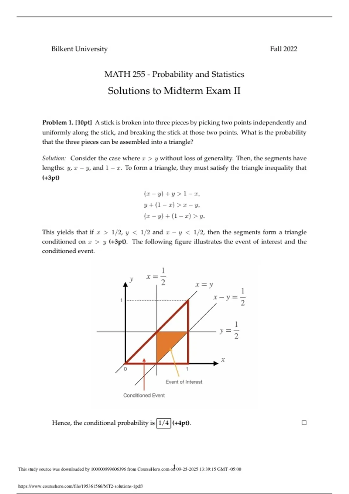 MATH 255 - Probability and Statistics Solutions to Midterm Exam II Problem 1. [10pt] A stick is broken into three pieces by picking two points independently and uniformly along the stick, and breaking the stick at those two points. What is the probability that the three pieces can be assembled into a triangle? Solution: Consider the case where x > y without loss of generality. Then, the segments have lengths: y, x − y, and 1 − x. To form a triangle, they must satisfy the triangle inequality that (+3pt) (x − y) + y > 1 − x, y + (1 − x) > x − y, (x − y) + (1 − x) > y. This yields that if x > 1/2, y < 1/2 and x − y < 1/2, then the segments form a triangle conditioned on x > y (+3pt). The following figure illustrates th