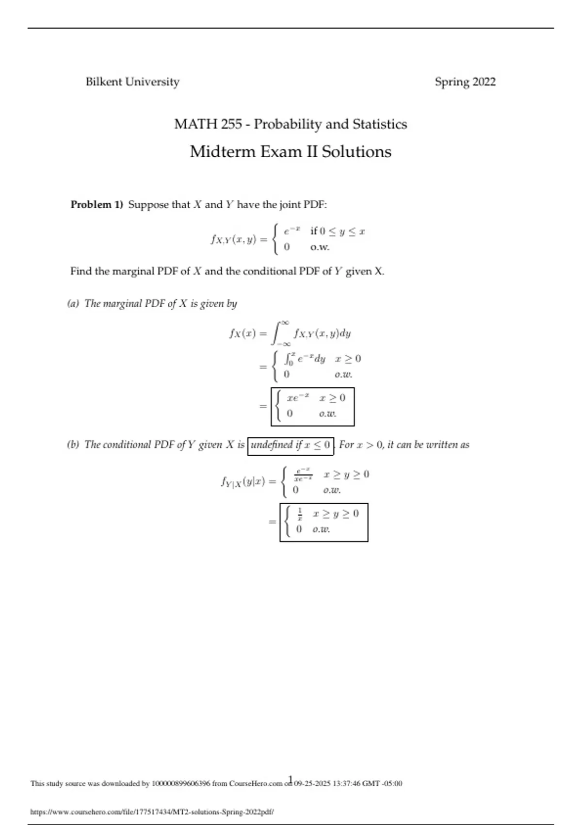 MATH 255 - Probability and Statistics Midterm Exam II Solutions Problem 1) Suppose that X and Y have the joint PDF: fX,Y (x, y) = ( e −x if 0 ≤ y ≤ x 0 o.w. Find the marginal PDF of X and the conditional PDF of Y given X. (a) The marginal PDF of X is given by fX(x) = Z ∞ −∞ fX,Y (x, y)dy = ( R x 0 e −xdy x ≥ 0 0 o.w. = ( xe−x x ≥ 0 0 o.w. (b) The conditional PDF of Y given X is undefined if x ≤ 0 . For x > 0, it can be written as fY |X(y|x) = ( e−x xe−x x ≥ y ≥ 0 0 o.w. = ( 1 x x ≥ y ≥ 0