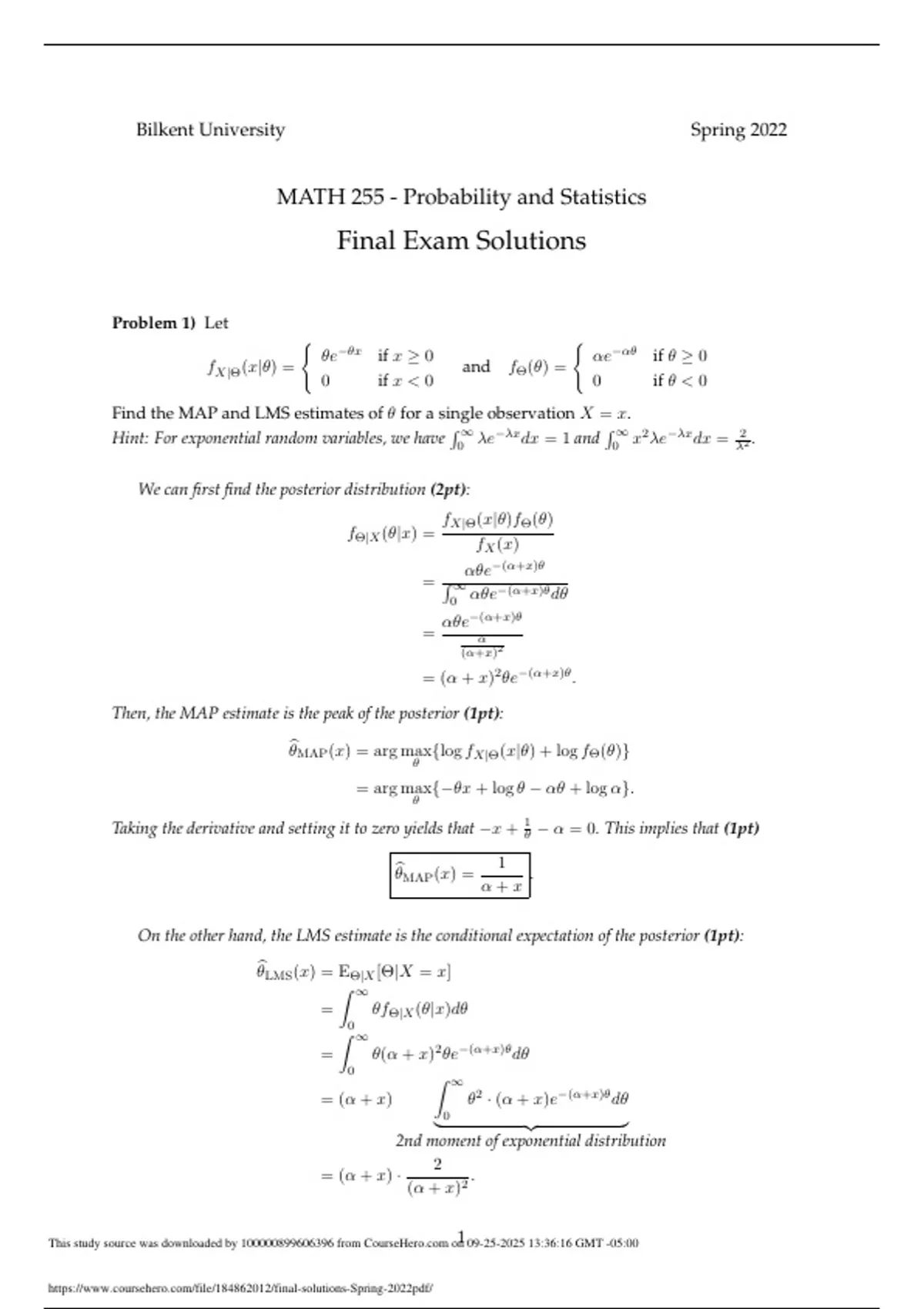 MATH 255 - Probability and Statistics Final Exam Solutions Problem 1) Let fX|Θ(x|θ) = ( θe−θx if x ≥ 0 0 if x < 0 and fΘ(θ) = ( αe−αθ if θ ≥ 0 0 if θ < 0 Find the MAP and LMS estimates of θ for a single observation X = x. Hint: For exponential random variables, we have R ∞ 0 λe−λxdx = 1 and R ∞ 0 x 2λe−λxdx = 2 λ2 . We can first find the posterior distribution (2pt): fΘ|X(θ|x) = fX|Θ(x|θ)fΘ(θ) fX(x) = αθe−(α+x)θ R ∞ 0 αθe−(α+x)θdθ = αθe−(α+x)θ α (α+x) 2 = (α + x) 2 θe−(α+x)θ . Then, the MAP estimate is the peak of the posterior (1pt): θbMAP(x) = arg max θ {log fX|Θ(x|θ) + log fΘ(θ)} = arg max θ {−θx + log θ − αθ + log α}. Taking the derivative and setting it to zero yields that −x + 1 θ − α = 0. This implies that (1pt) θbMAP(x) = 1 α + x . On the other hand, the LMS estimate is the conditional expectation of the posterior (1pt): θb LMS(x) = EΘ|X[Θ|X = x] = Z ∞ 0 θfΘ|X(θ|x)dθ = Z ∞ 0 θ(α + x) 2 θe−(α+x)θ dθ = (α + x) Z ∞ 0 θ 2 · (α + x)e −(α+x)θ dθ | {z } 2nd moment of exponential distribution = (α + x) · 2 (α + x) 2 .