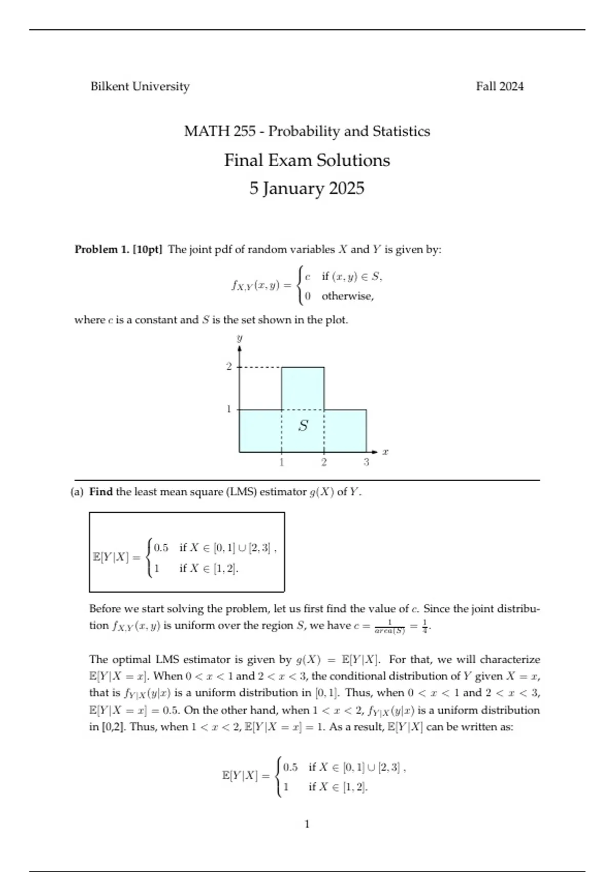 MATH 255 - Probability and Statistics Final Exam Solutions 5 January 2025 Problem 1. [10pt] The joint pdf of random variables X and Y is given by: fX,Y (x, y) =    c if (x, y) ∈ S, 0 otherwise, where c is a constant and S is the set shown in the plot. (a) Find the least mean square (LMS) estimator g(X) of Y . E[Y |X] =    0.5 if X ∈ [0, 1] ∪ [2, 3] , 1 if X ∈ [1, 2]. Before we start solving the problem, let us first find the value of c. Since the joint distribution fX,Y (x, y) is uniform over the region S, we have c = 1 area(S) = 1 4 . The optimal LMS estimator is given by g(X) = E[Y |X]. For that, we will characterize E[Y |X = x]. When 0 < x < 1 and 2 < x < 3, the conditional distribution of Y given X = x, that is fY |X(y|x) is a uniform distribution in [0, 1]. Thus, when 0 < x < 1 and 2 < x < 3, E[Y |X = x] = 0.5. On the other hand, when 1 < x < 2, fY |X(y|x) is a uniform distribution in [0,2]. Thus, when 1 < x < 2, E[Y |X = x] = 1. As a result, E[Y |X] can be written as: E[Y |X] =    0.5 if X ∈ [0, 1] ∪ [2, 3] , 1 if X ∈ [1, 2]. 1 (b) Find the mean squared error of the estimator g(X), i.e., E[(Y − g(X))2 ]. E[(Y − g(X))2 ] = 5 24 . Next, we will find the mean squared error of the estimator g(X). For that, we will use the uniform distribution mean and variance. If U is a continuous r.v. in between [a, b], its mean and variance is given by E[U] = a+b 2 and Var(U) = (b−a) 2 12 . We will also utilize the law of iterated expectation for this part in the following form: E[(Y − g(X))2 ]