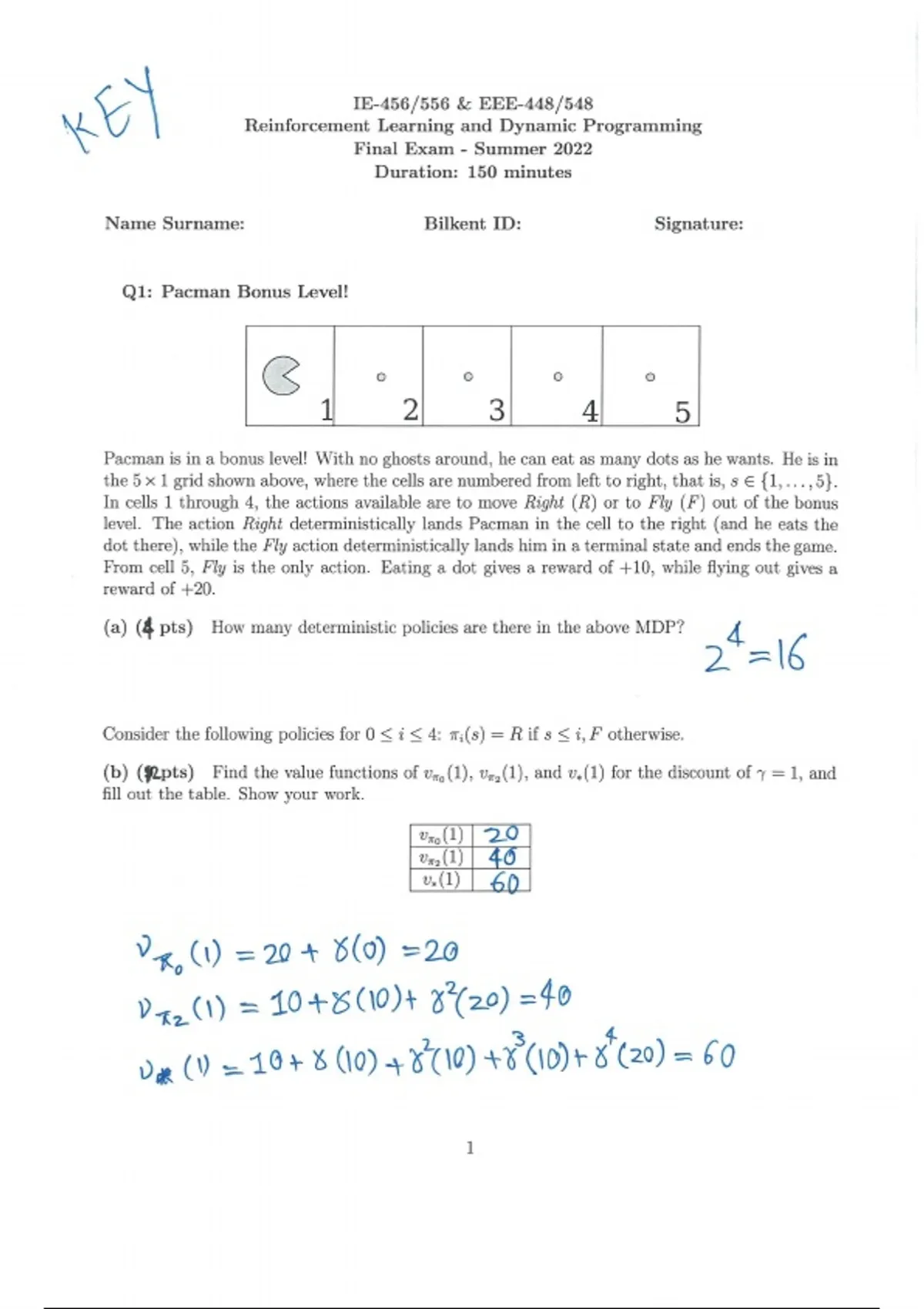 IE—456/556 & EEE-448/548 %% Reinforcement Learning and Dynamic Programming Final Exam - Summer 2022 Duration: 150 minutes Name Surname: Bilkent ID: Signature: Q1: Pacman Bonus Level! o o o (€] 1 2 3 4 o) Pacman is in a bonus level! With no ghosts around, he can eat as many dots as he wants. He is in the 5 x 1 grid shown above, where the cells are numbered from left to right, that is, s € {1,...,5}. In cells 1 through 4, the actions available are to move Right (R) or to Fly (F') out of the bonus level. The action Right deterministically lands Pacman in the cell to the right (and he eats the dot there), while the Fly action deterministically lands him in a terminal state and ends the game. From cell 5, Fly is the only action. Eating a dot gives a reward of +10, while flying out gives a reward of +20. 4 2 =§ (a) (4 pts) How many deterministic policies are there in the above MDP? Consider the following policies for 0 < i < 4: 7;(s) = R if s <4, F' otherwise. (b) ($2pts) Find the value functions of vx, (1), vr,(1), and v,(1) for the discount of v = 1, and fill out the table. Show your work. Uny (1) 20 Uy (1) 4’6 (D | 40 Vg (1) =20+ 8(0) =20 Do, (1) = 10+800)+ ¥7(29) =40 4 og () =16+ % 10) 4 50 +T(0)T & (20) = 60