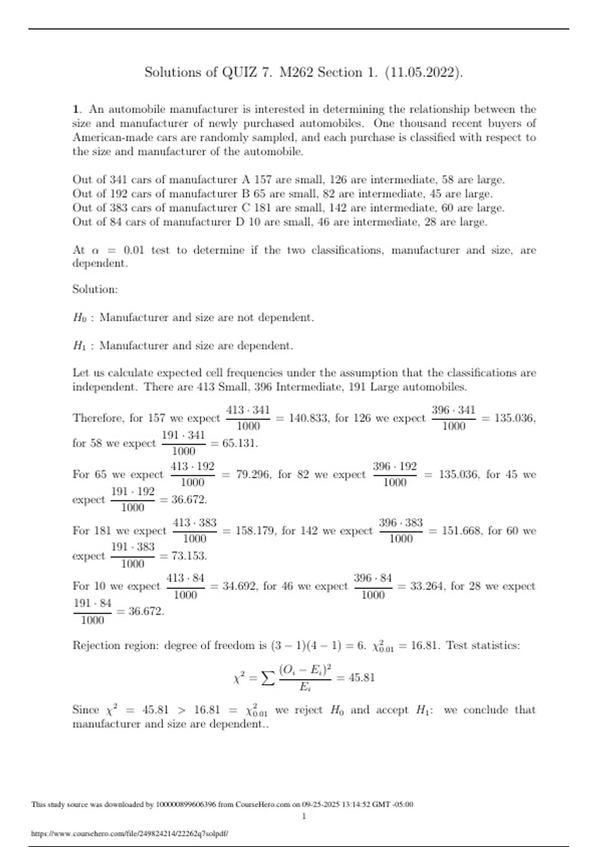 1. An automobile manufacturer is interested in determining the relationship between the size and manufacturer of newly purchased automobiles. One thousand recent buyers of American-made cars are randomly sampled, and each purchase is classified with respect to the size and manufacturer of the automobile. Out of 341 cars of manufacturer A 157 are small, 126 are intermediate, 58 are large. Out of 192 ca