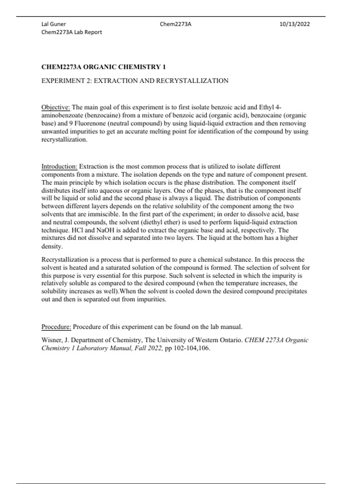 CHEM2273A ORGANIC CHEMISTRY 1 EXPERIMENT 2: EXTRACTION AND RECRYSTALLIZATION Objective: The main goal of this experiment is to first isolate benzoic acid and Ethyl 4- aminobenzoate (benzocaine) from a mixture of benzoic acid (organic acid), benzocaine (organic base) and 9 Fluorenone (neutral compound) by using liquid-liquid extraction and then removing unwanted impurities to get an accurate melting point for identification of the compound by using recrystallization. Introduction: Extraction is the most common process that is utilized to isolate different components from a mixture. The isolation depends on the type and nature of component present. The main principle by which isolation occurs is the phase distribution. The component itself distributes itself into aqueous or organic layers. One of the phases, that is the component itself will be liquid or solid and the second phase is always a liquid. The distribution of components between different layers depends on the relative solubility of the component among the two solvents that are immiscible. In the first part of the experiment; in order to dissolve acid, base and neutral compounds, the solvent (diethyl ether) is used to perform liquid-liquid extraction technique. HCl and NaOH is added to extract the organic base and acid, respectively. The mixtures did not dissolve and separated into two layers. The liquid at the bottom has a higher density. Recrystallization is a process that is performed to pure a chemical substance. In this process the solvent is heated and a saturated solution of the compound is formed. The selection of solvent for this purpose is very essential for this purpose. Such solvent is selected in which the impurity is relatively soluble as compared to the desired compound (when the temperature increases, the solubility increases as well).When the solvent is cooled down the desired compound precipitates out and then is separated out from impurities. Procedure: Procedure of this experiment can be found on the lab manual. Wisner, J. Department of Chemistry, The University of Western Ontario. CHEM 2273A Organic Chemistry 1 Laboratory Manual, Fall 2022, pp 102-104,106.