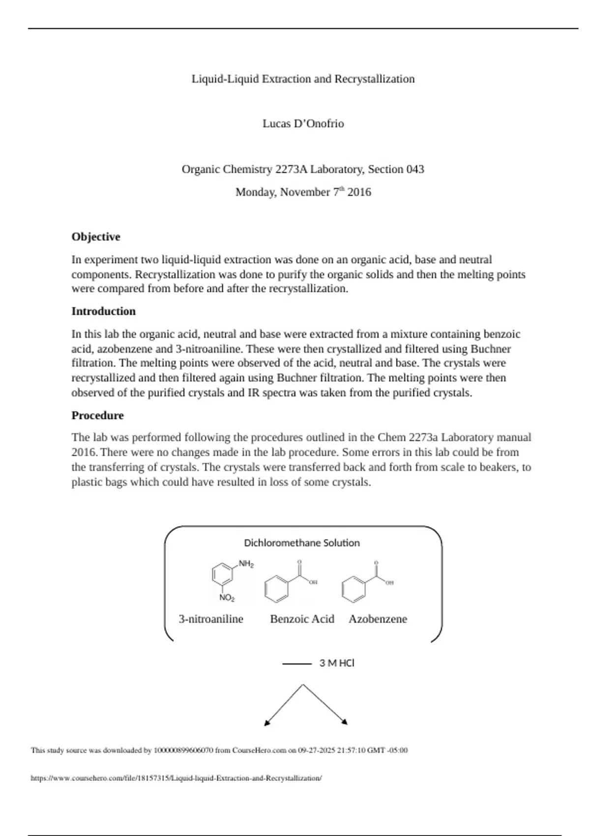 Liquid-Liquid Extraction and Recrystallization Lucas D’Onofrio Organic Chemistry 2273A Laboratory, Section 043 Monday, November 7th 2016 Objective In experiment two liquid-liquid extraction was done on an organic acid, base and neutral components. Recrystallization was done to purify the organic solids and then the melting points were compared from before and after the recrystallization. Introduction In this lab the organic acid, neutral and base were extracted from a mixture containing benzoic acid, azobenzene and 3-nitroaniline. These were then crystallized and filtered using Buchner filtration. The melting points were observed of the acid, neutral and base. The crystals were recrystallized and then filtered again using Buchner filtration. The melting points were then observed of the purified crystals and IR spectra was taken from the purified crystals. Procedure The lab was performed following the procedures outlined in the Chem 2273a Laboratory manual 2016.There were no changes made in the lab procedure. Some errors in this lab could be from the transferring of crystals. The crystals were transferred back and forth from scale to beakers, to plastic bags which could have resulted in loss of some crystals. Dich