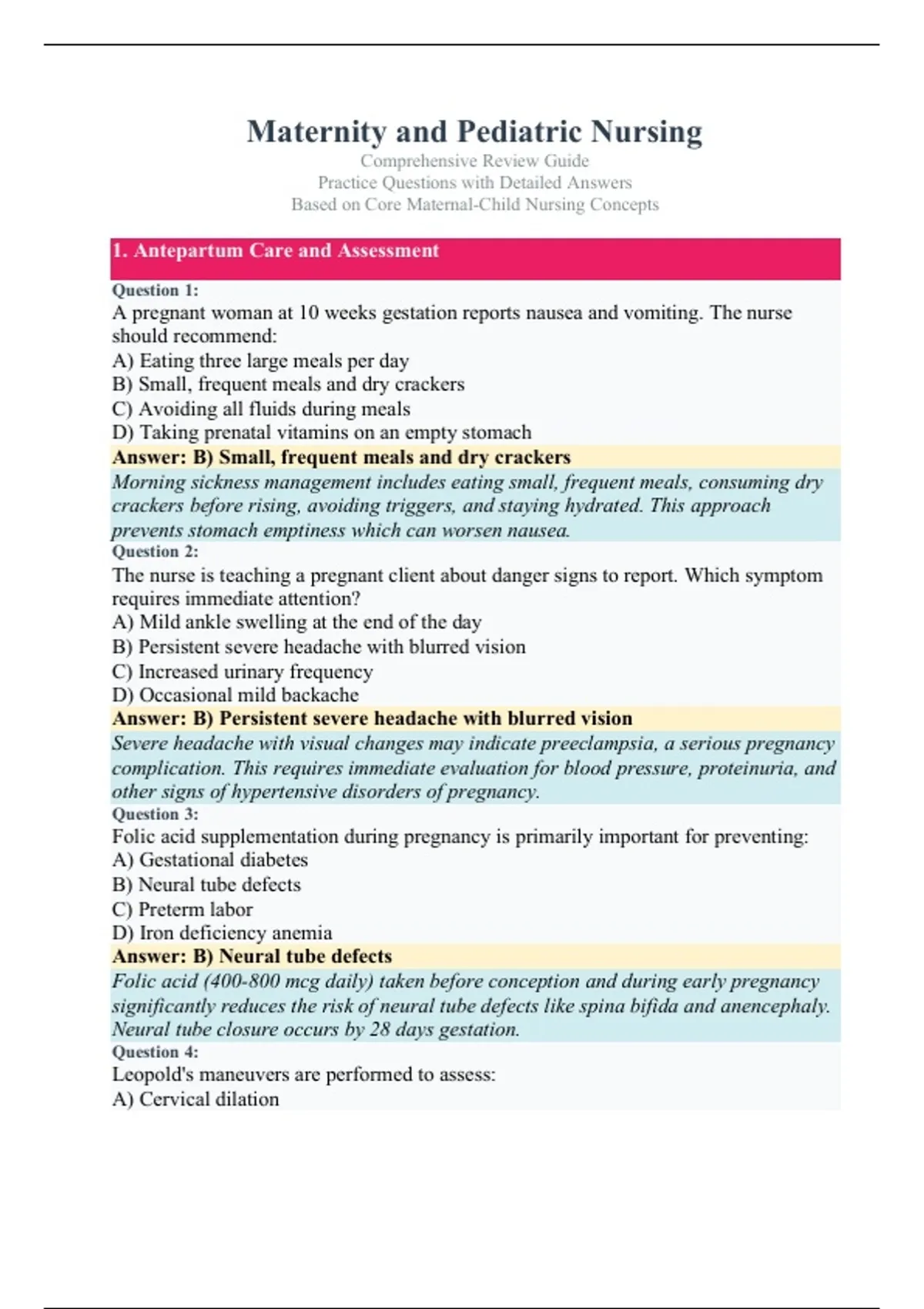 1. Antepartum Care and Assessment Question 1: A pregnant woman at 10 weeks gestation reports nausea and vomiting. The nurse should recommend: A) Eating three large meals per day B) Small, frequent meals and dry crackers C) Avoiding all fluids during meals D) Taking prenatal vitamins on an empty stomach Answer: B) Small, frequent meals and dry crackers Morning sickness management includes eating small, frequent meals, consuming dry crackers before rising, avoiding triggers, and staying hydrated. This approach prevents stomach emptiness which can worsen nausea. Question 2: The nurse is teaching a pregnant client about danger signs to report. Which symptom requires immediate attention? A) Mild ankle swelling at the end of the day B) Persistent severe headache with blurred vision C) Increased urinary frequency D) Occasional mild backache Answer: B) Persistent severe headache with blurred vision Severe headache with visual changes may indicate preeclampsia, a serious pregnancy complication. This requires immediate evaluation for blood pressure, proteinuria, and other signs of hypertensive disorders of pregnancy. Question 3: Folic acid supplementation during pregnancy is primarily important for preventing: A) Gestational diabetes B) Neural tube defects C) Preterm labor D) Iron deficiency anemia Answer: B) Neural tube defects Folic acid (400-800 mcg daily) taken before conception and during early pregnancy significantly reduces the risk of neural tube defects like spina bifida and anencephaly. Neural tube closure occurs by 28 days gestation. Question 4: Leopold's maneuvers are performed to assess: A) Cervical dilation B) Fetal heart rate patterns C) Fetal position and presentation D) Uterine contractions Answer: C) Fetal position and presentation Leopold's maneuvers are systematic abdominal palpation techniques used to determine fetal lie, presentation, position, and engagement. This information helps plan delivery approach and anticipate potential complications. NURSING PRIORITY: Monitor for signs of preeclampsia - hypertension, proteinuria, edema, headache, visual changes, and epigastric pain. 2. High-Risk Pregnancy Conditions Question 5: A client with gestational diabetes is taught to monitor blood glucose. The target fasting glucose level is: A) Less than 95 mg/dL B) Less than 120 mg/dL C) Less than 140 mg/dL D) Less than 180 mg/dL