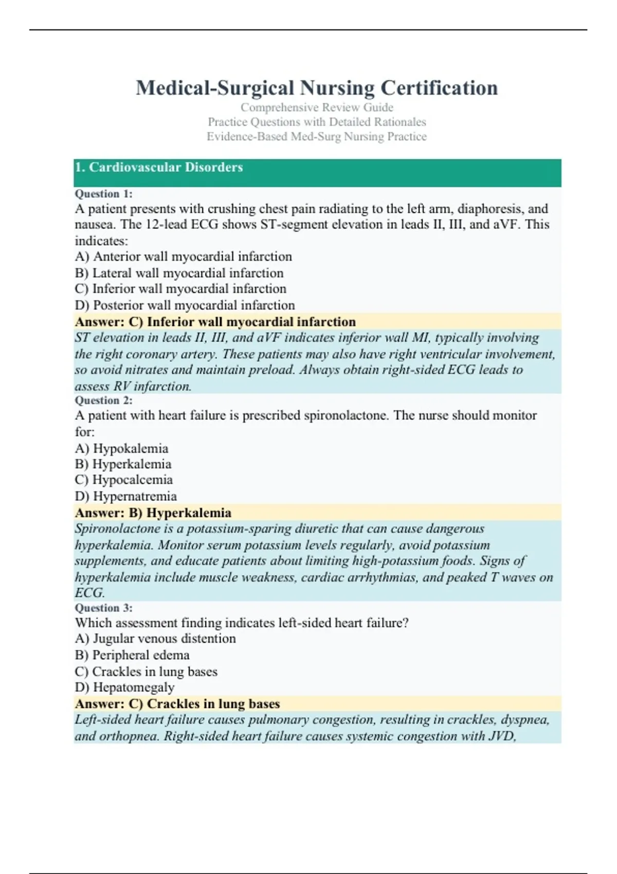 Practice Questions with Detailed Rationales Evidence-Based Med-Surg Nursing Practice 1. Cardiovascular Disorders Question 1: A patient presents with crushing chest pain radiating to the left arm, diaphoresis, and nausea. The 12-lead ECG shows ST-segment elevation in leads II, III, and aVF. This indicates: A) Anterior wall myocardial infarction B) Lateral wall myocardial infarction C) Inferior wall myocardial infarction D) Posterior wall myocardial infarction Answer: C) Inferior wall myocardial infarction ST elevation in leads II, III, and aVF indicates inferior wall MI, typically involving the right coronary artery. These patients may also have right ventricular involvement, so avoid nitrates and maintain preload. Always obtain right-sided ECG leads to assess RV infarction. Question 2: A patient with heart failure is prescribed spironolactone. The nurse should monitor for: A) Hypokalemia B) Hyperkalemia C) Hypocalcemia D) Hypernatremia Answer: B) Hyperkalemia Spironolactone is a potassium-sparing diuretic that can cause dangerous hyperkalemia. Monitor serum potassium levels regularly, avoid potassium supplements, and educate patients about limiting high-potassium foods. Signs of hyperkalemia include muscle weakness, cardiac arrhythmias, and peaked T waves on ECG. Question 3: Which assessment finding indicates left-sided heart failure? A) Jugular venous distention