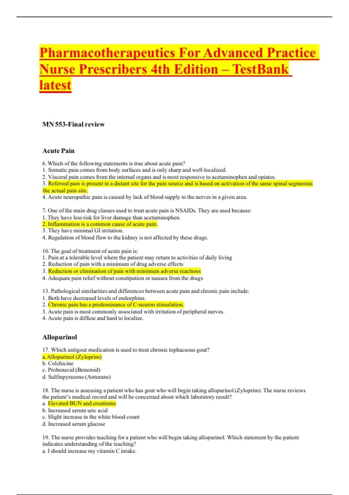 Pharmacotherapeutics For Advanced Practice Nurse Prescribers 4th Edition – TestBank latest