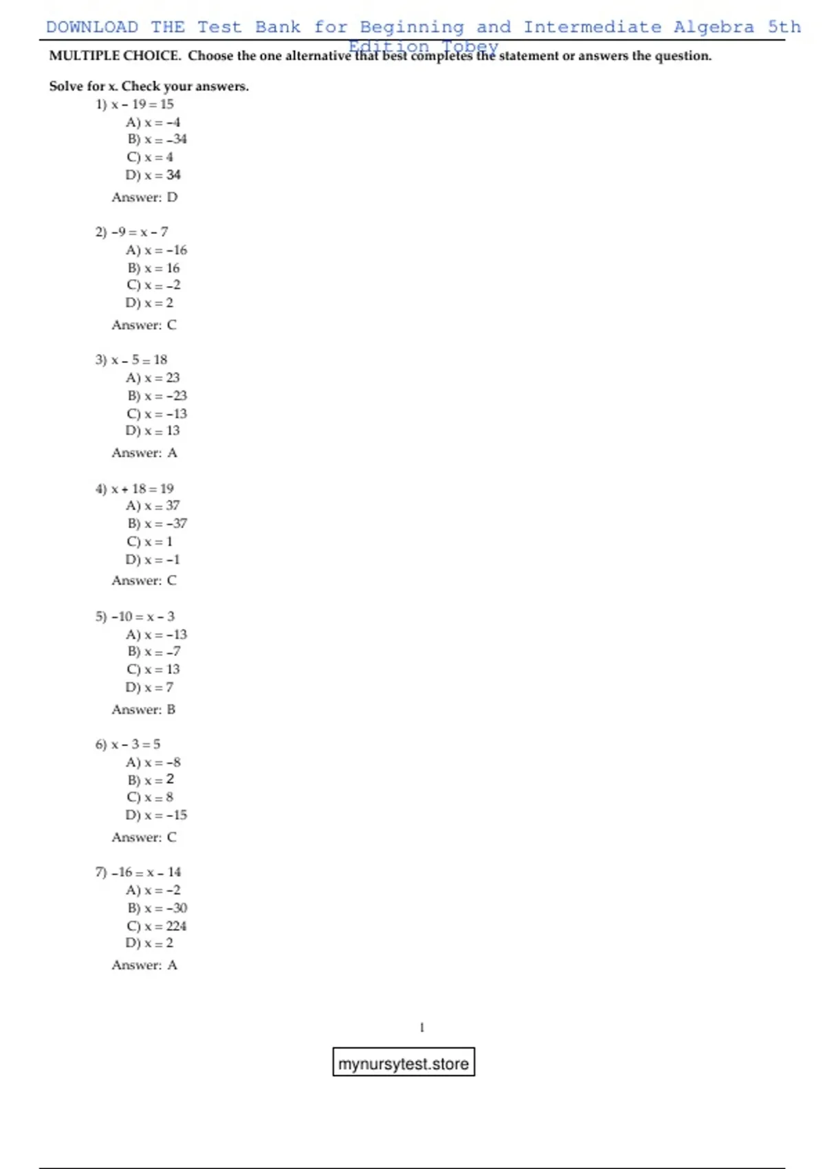 Solve for x. Check your answers. 1) x - 19 = 15 A) x = -4 B) x = -34 C) x = 4 D) x = 34 Answer: D 2)-9 = x - 7 A) x = -16 B) x = 16 C) x = -2 D) x = 2 Answer: C 3) x - 5 = 18 A) x = 23 B) x = -23 C) x = -13 D) x = 13 Answer: A 4) x + 18 = 19 A) x = 37 B) x = -37 C) x = 1 D) x = -1 Answer: C 5)-10 = x - 3 A) x = -13 B) x = -7 C) x = 13 D) x = 7 Answer: B 6) x - 3 = 5 A) x = -8 B) x = 2 C) x = 8 D) x = -15 Answer: C 7)-16 = x - 14 A) x = -2 B) x = -30 C) x = 224 D) x = 2 Answer: A 1 DOWNLOAD THE Test Bank for Beginning and Intermediate Algebra 5th Edition Tobey 8) 9 + 11 + x = 6 + 8 A) x = -22 B) x = -6 C) x = 16 D) x = 34 Answer: B 9) 5 - 17 + 8 = 6 + x - 3 A) x = -13 B) x = 33 C) x = 5 D) x = -7 Answer: D 10) 17 - 12 = x - 6 A) x = 35 B) x = -1 C) x = 11 D) x = 23 Answer: C Find the value of x that satisfies the equation. 11)-0.6 + x = 17 A) x = 17.1 B) x = 16.4 C) x = 17.6 D) x = 15.9 Answer: C 12) 8.3 = 15 - x A) x = 6.7 B) x = 22.8 C) x = 23.3 D) x = 6.2 Answer: A 13) 0.1 + x + 2.3 = 3.6 A) x = 6 B) x = 1.4 C) x = 5.8 D) x = 1.2 Answer: D 14) 2.9 = 21.6 - x A) x = 24 B) x = 18.7 C) x = 24.5 D) x = 18.2 Answer: B 2