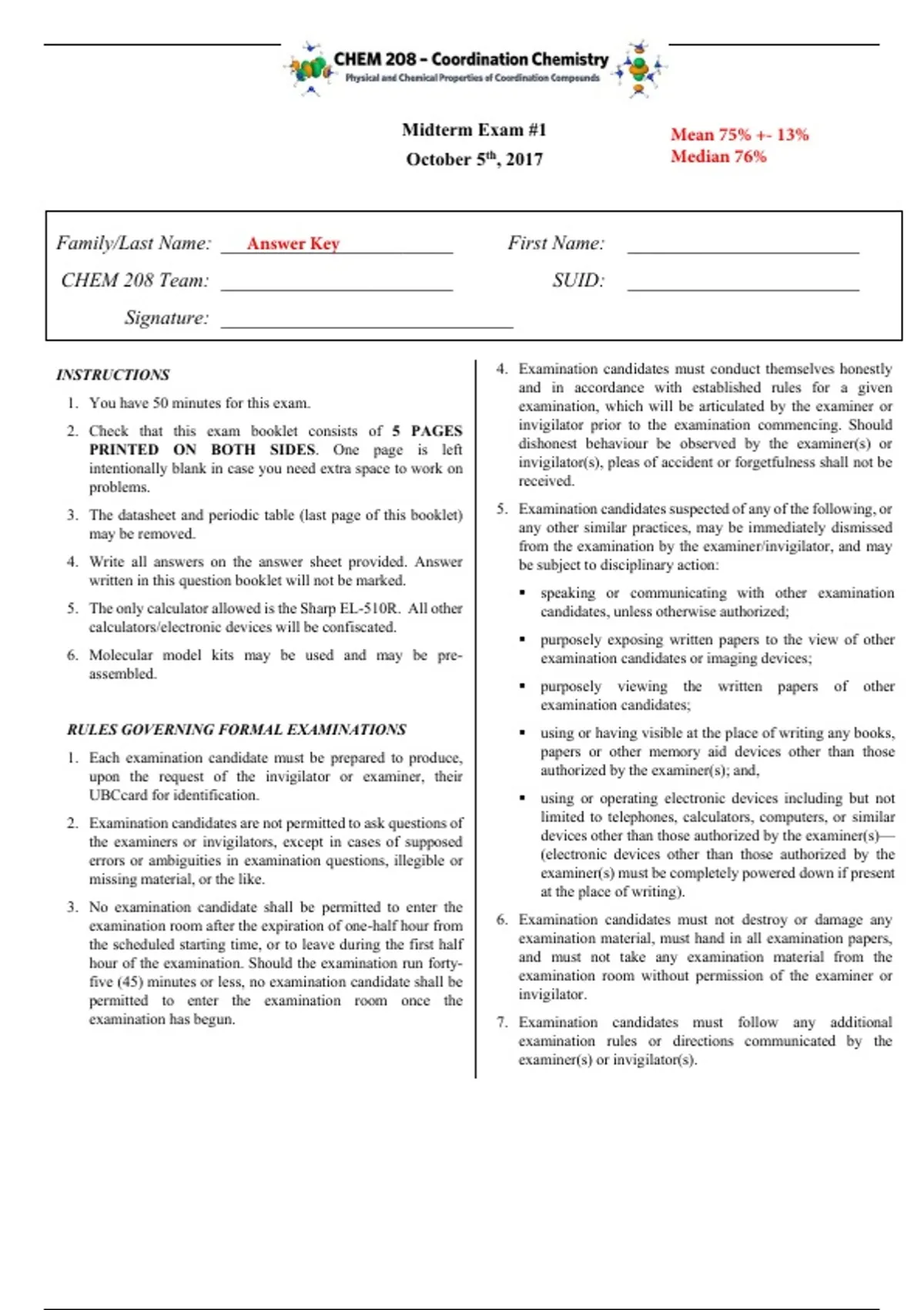INSTRUCTIONS 1. You have 50 minutes for this exam. 2. Check that this exam booklet consists of 5 PAGES PRINTED ON BOTH SIDES. One page is left intentionally blank in case you need extra space to work on problems. 3. The datasheet and periodic table (last page of this booklet) may be removed. 4. Write all answers on the answer sheet provided. Answer written in this question booklet will not be marked. 5. The only calculator allowed is the Sharp EL-510R. All other calculators/electronic devices will be confiscated. 6. Molecular model kits may be used and may be preassembled. RULES GOVERNING FORMAL EXAMINATIONS 1. Each examination candidate must be prepared to produce, upon the request of the invigilator or examiner, their UBCcard for identification. 2. Examination candidates are not permitted to ask questions of the examiners or invigilators, except in cases of supposed errors or ambiguities in examination questions, illegible or missing material, or the like. 3. No examination candidate shall be permitted to enter the examination room after the expiration of one-half hour from the scheduled starting time, or to leave during the first half hour of the examination. Should the examination run fortyfive (45) minutes or less, no examination candidate shall be permitted to enter the examination room once the examination has begun. 4. Examination candidates must conduct themselves honestly and in accordance with established rules for a given examination, which will be articulated by the examiner or invigilator prior to the examination commencing. Should dishonest behaviour be observed by the examiner(s) or invigilator(s), pleas of accident or forgetfulness shall not be received. 5. Examination candidates suspected of any of the following, or any other similar practices, may be immediately dismissed from the examination by the examiner/invigilator, and may be subject to disciplinary action:  speaking or communicating with other examination candidates, unless otherwise authorized;  purposely exposing written papers to the view of other examination candidates or imaging devices;  purposely viewing the written papers of other examination candidates;  using or having visible at the place of writing any books, papers or other memory aid devices other than those authorized by the examiner(s); and,  using or operating electronic devices including but not limited to telephones, calculators, computers, or similar devices other than those authorized by the examiner(s)— (electro