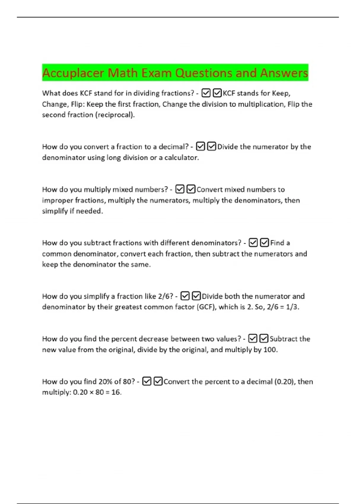Accuplacer Math Exam Questions and Answers What does KCF stand for in dividing fractions? - KCF stands for Keep, Change, Flip: Keep the first fraction, Change the division to multiplication, Flip the second fraction (reciprocal). How do you convert a fraction to a decimal? - Divide the numerator by the denominator using long division or a calculator. How do you multiply mixed numbers? - Convert mixed numbers to improper fractions, multiply the numerators, multiply the denominators, then simplify if needed.