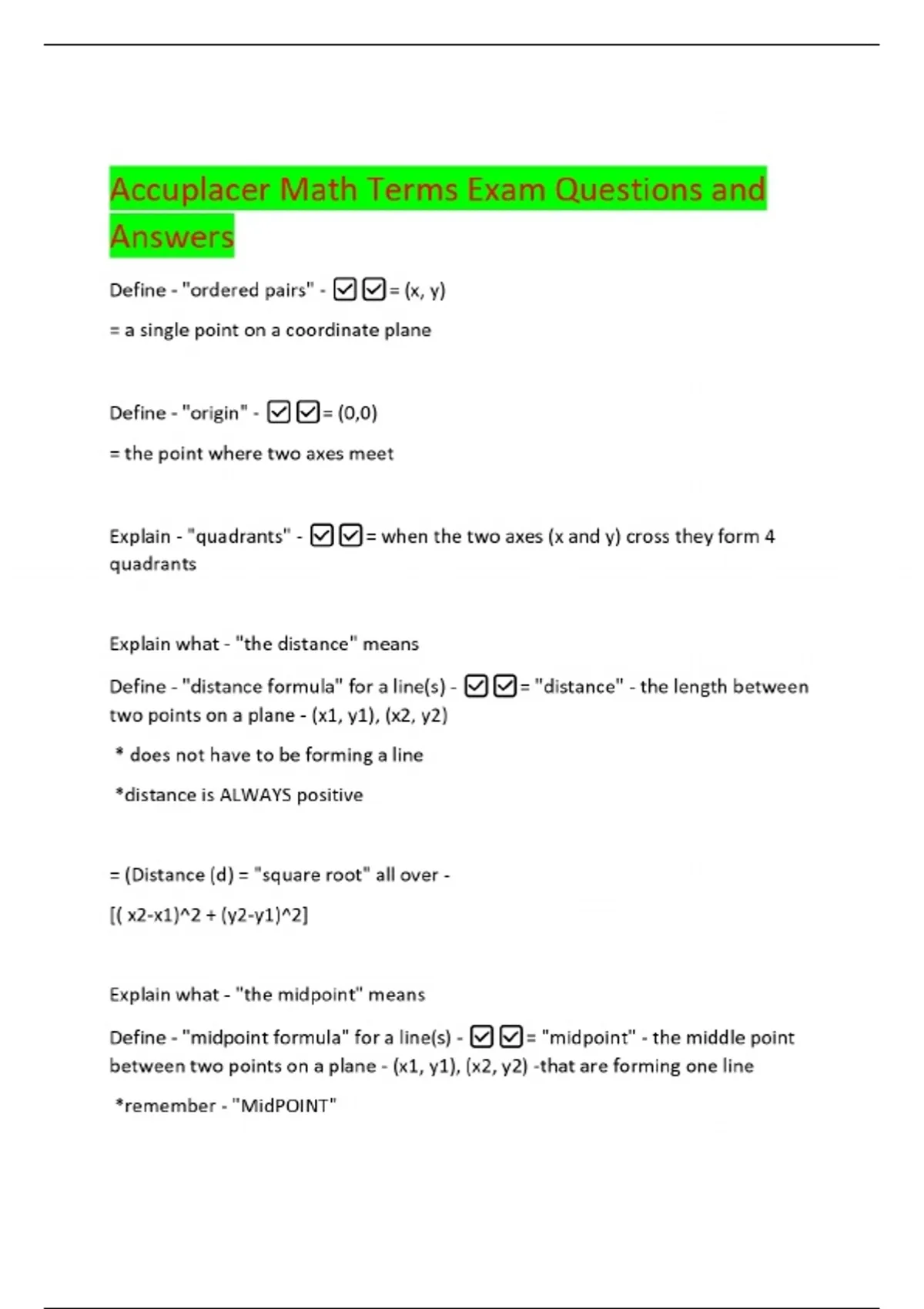Accuplacer Math Terms Exam Questions and Answers Define - "ordered pairs" - = (x, y) = a single point on a coordinate plane Define - "origin" - = (0,0) = the point where two axes meet Explain - "quadrants" - = when the two axes (x and y) cross they form 4 quadrants Explain what - "the distance" means Define - "distance formula" for a line(s) - = "distance" - the length between two points on a plane - (x1, y1), (x2, y2) * does not have to be forming a line